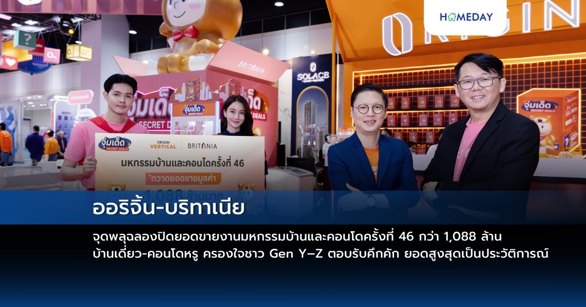 ออริจิ้น เวอร์ติเคิล – บริทาเนีย ตอกย้ำผู้นำตลาดคอนโดมิเนียมพร้อมอยู่ใกล้รถไฟฟ้า และบ้านเดี่ยว บ้านแฝด ทาวน์โฮม สไตล์อังกฤษฟังก์ชันตอบโจทย์ ประกาศความสำเร็จในงานบิ๊กอีเวนท์มหกรรมบ้านและคอนโดครั้งที่ 46 ณ ศูนย์การประชุมแห่งชาติสิริกิติ์ กวาดยอดขายทะลุ 1,088 ล้านบาท สูงสุดเป็นประวัติการณ์ หลังแคมเปญ “จุ่มเด็ด Secret Deals” สร้างสีสัน พร้อมหนุนยอดโครงการใกล้รถไฟฟ้า ใกล้ทางด่วน แบรนด์คอนโดหรู “พาร์ค ออริจิ้น” คอนโดคนรุ่นใหม่ “ออริจิ้น ปลั๊ก แอนด์เพลย์” และบ้านเดี่ยว บ้านซีรีส์ใหม่ ทาวน์โฮม “บริทาเนีย” นำทีมแบรนด์โครงการขายดี เลย์เอาท์ ฟังก์ชันโดดเด่น ขยายเวลารับโปรพิเศษ โปรเดียวกับงานมหกรรมบ้านและคอนโดต่อเนื่องถึง 10 พ.ย.นี้