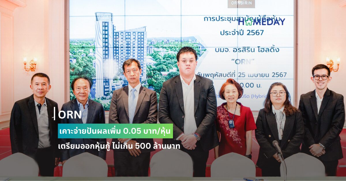 นายปรีดิกร บูรณุปกรณ์ ประธานเจ้าหน้าที่บริหาร บริษัท อรสิรินโฮลดิ้ง จํากัด (มหาชน) หรือ ORN เปิดเผยว่า ที่ประชุมผู้ถือหุ้นมีมติอนุมัติจ่ายเงินปันผลประจำปี 2566 เพิ่มเติม เป็นเงินสดในอัตราหุ้นละ 0.05 บาท รวมเป็นเงินทั้งสิ้น 75 ล้านบาท โดยกำหนดรายชื่อผู้ถือหุ้นที่มีสิทธิรับเงินปันผล (Record Date) 8 พ.ค. 67 กำหนดจ่ายปันผล 24 พ.ค. 67