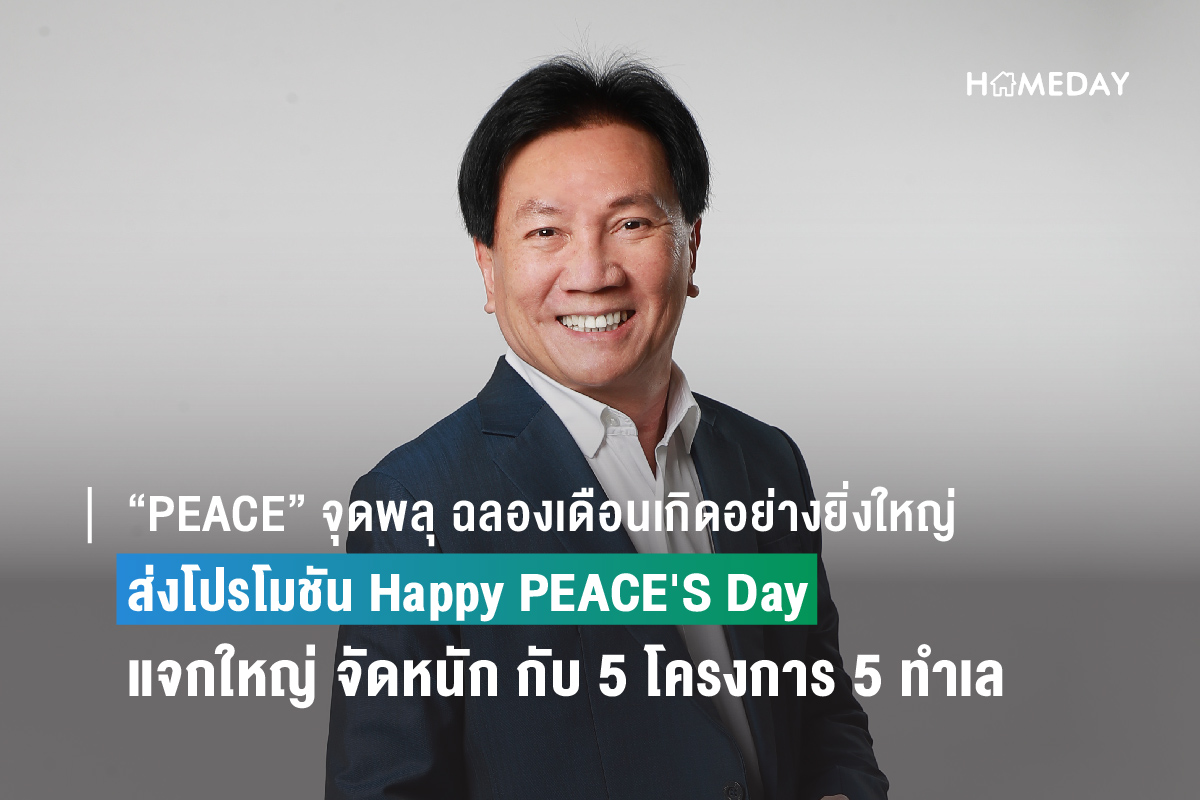 นายประสพศักดิ์ ศิริโสภณา ประธานเจ้าหน้าที่บริหาร บริษัท พีซแอนด์ลีฟวิ่ง จำกัด (มหาชน) หรือ PEACE ผู้พัฒนาอสังหาริมทรัพย์ประเภทที่อยู่อาศัยแนวราบที่มีประสบการณ์มากว่า 30 ปี กล่าวว่า เพื่อเป็นการฉลองครบรอบเดือนเกิดอย่างยิ่งใหญ่ของบริษัทฯ จึงได้มอบโปรโมชันสุดพิเศษ “Happy PEACE’S Day” ที่แจกใหญ่ จัดหนัก เพื่อเป็นของขวัญให้สำหรับผู้ที่กำลังมองหาที่อยู่อาศัยคุณภาพ บนทำเลศักยภาพทั้ง 5 ทำเล ได้แก่ กรุงเทพกรีฑา, อุดมสุข, วัชรพล, บางขุนนนท์ และสุขสวัสดิ์ กับข้อเสนอสุดพิเศษที่แจกใหญ่ จัดหนัก ไม่ว่าจะเป็น ส่วนลดสุดพิเศษ* ฟรีแอร์ทั้งหลัง และของแถมกว่า 10 รายการ ในราคาเริ่มต้นเพียง 2.92 – 12 ล้านบาท* เฉพาะเดือนพฤษภาคมนี้เท่านั้น