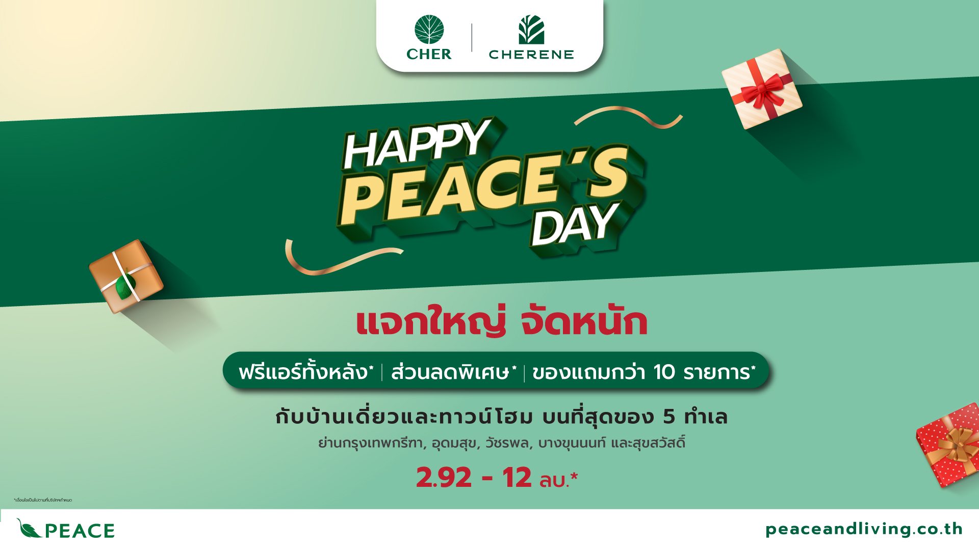 “พีซแอนด์ลีฟวิ่ง” ฉลองครบรอบเดือนเกิดอย่างยิ่งใหญ่ มอบของขวัญสุดพิเศษให้สำหรับลูกค้าที่สนใจเป็นเจ้าของโครงการบ้านและทาวน์โฮมคุณภาพใน 5 ทำเลทอง กับโปรโมชั่น “Happy PEACE’S Day” ที่แจกใหญ่ จัดหนัก พร้อมมอบส่วนลดสุดพิเศษ* และของแถมอีกมากมาย ในราคาเริ่มต้นเพียง 2.92 – 12 ล้านบาท* ตลอดเดือนพฤษภาคมนี้