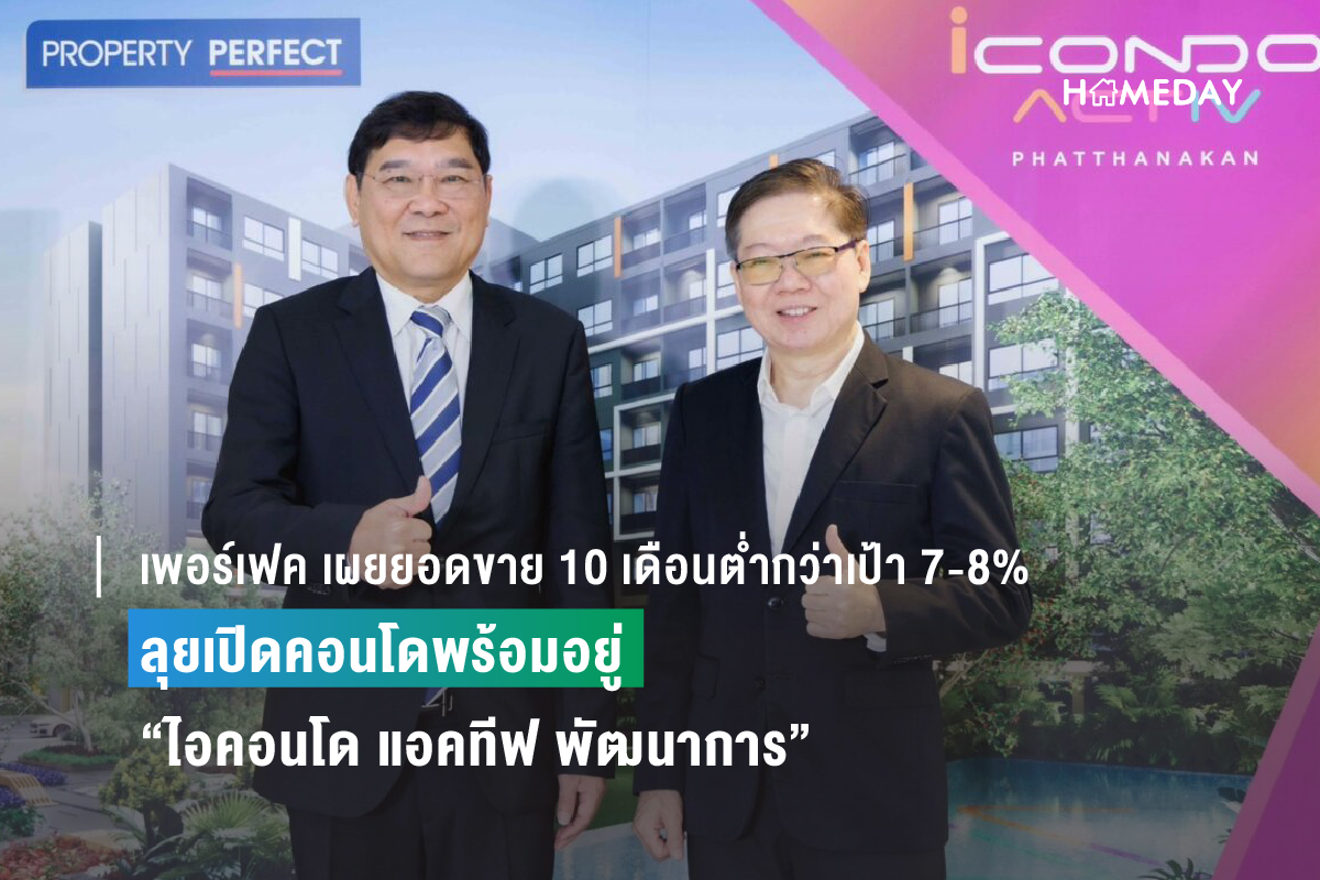 เพอร์เฟค เผยยอดขาย 10 เดือนทำได้ 8.000 ล้านบาท ต่ำกว่าเป้าหมาย 7-8% ผลกระทบจากภาวะเศรษฐกิจ ดอกเบี้ยสูง หนี้ครัวเรือนพุ่ง ฉุดกำลังซื้อลดลง พร้อมลุยส่ง “ไอคอนโด แอคทีฟ พัฒนาการ” คอนโดสร้างเสร็จพร้อมอยู่ เอาใจคนรุ่นใหม่ เลือกใช้ชีวิตในแบบตัวเองได้เต็มที่กับคอนเซ็ปต์ “Active” เปิดตัวเป็นทางการให้ชมห้องตัวอย่างบนตึกจริงครั้งแรก ด้วยราคาเริ่มต้น 2.27 ล้านบาท