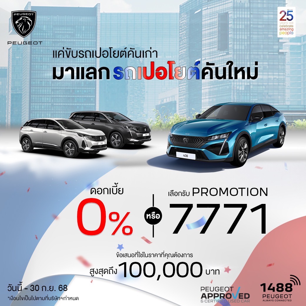 สัมผัสรถผู้บริหารป้ายแดง ราคาสุดพิเศษ ภายในงาน ‘PEUGEOT EXECUTIVE CAR FESTIVAL’ วันนี้ถึง 14 กันยายน 2568 ที่โชว์รูม เปอโยต์ ไลอ้อน ออโตโมบิล สุขุมวิท และเกษตร-นวมินทร์