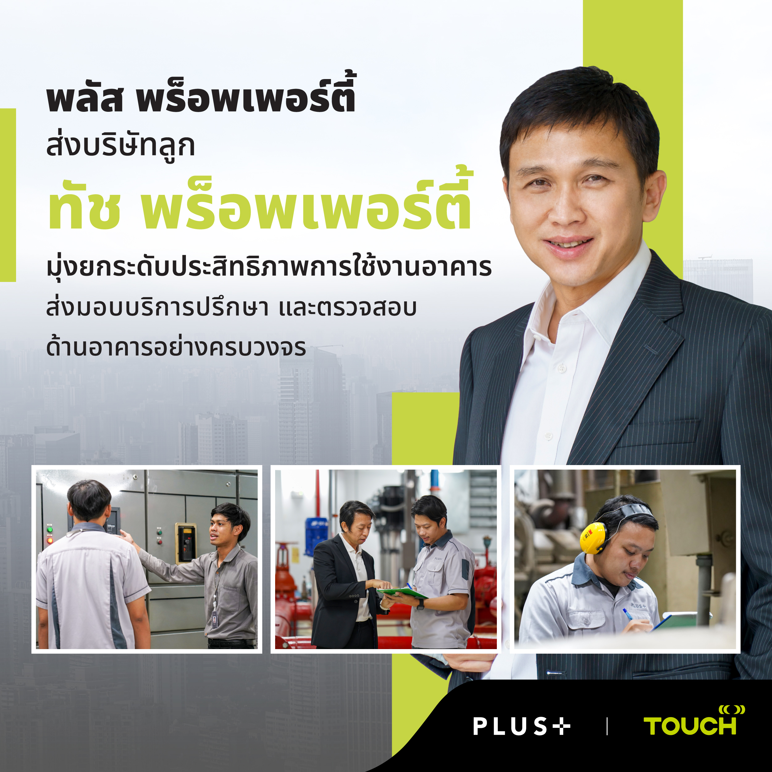 บริษัท ทัช พร็อพเพอร์ตี้ จำกัด ผู้เชี่ยวชาญด้านระบบวิศวกรรมอาคารครบวงจร ในเครือ บริษัท พลัส พร็อพเพอร์ตี้ จำกัด ปรับโฉมบริการใหม่เพื่อตอบโจทย์ความต้องการของเจ้าของอาคาร ผู้บริหาร และ ผู้ประกอบการ ขยายบริการสู่รูปแบบ Total Solution พัฒนาบริการให้ครอบคลุม ทั้งงานบำรุงรักษา ปรับปรุง เปลี่ยนทดแทน ฟื้นฟูสภาพ และพัฒนาอาคาร รวมถึงระบบวิศวกรรมอาคาร ด้วยทีมงานที่มีศักยภาพ ประสบการณ์ และระบบการทำงานอย่างมืออาชีพ ผ่านขั้นตอน แผนงาน วิธีการตามมาตรฐานสากล ชูแนวคิด “ทุกอาคารปลอดภัย มั่นใจในคุณภาพ” สร้างมูลค่าเพิ่มให้อาคารในระยะยาว