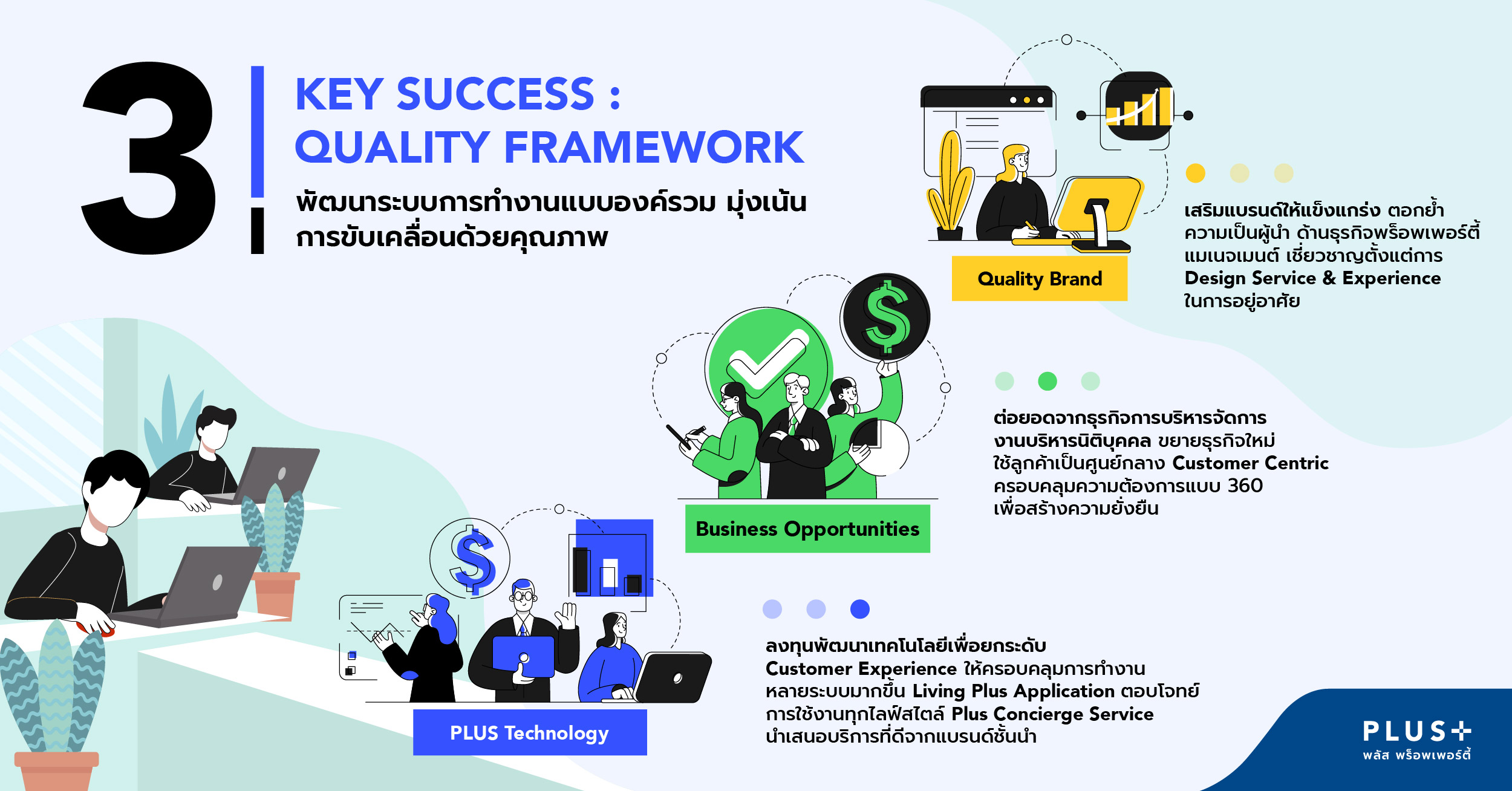 1.Quality Brand เสริมแบรนด์ให้แข็งแกร่ง ตอกย้ำความเป็นผู้นำด้านธุรกิจพร็อพเพอร์ตี้ แมเนจเมนต์ ด้วยประสบการณ์ในการทำงานกับลูกบ้านอย่างใกล้ชิดมีการเก็บข้อมูลมาวิเคราะห์ทำให้เข้าใจถึงความต้องการอย่างลึกซึ้ง โดยเฉพาะกลุ่มลูกค้าระดับ Luxuryที่เข้าใจใน Customer Journey เพิ่มศักยภาพทุกจุด Touch Point ในการบริการ สร้างประสบการณ์พิเศษเหนือระดับในทุกขั้นตอน พิถีพิถันการคัดเลือกบุคลากร พร้อมจัดอบรมและตรวจสอบคุณภาพการทำงานอย่างเข้มข้นอย่างสม่ำเสมอโดยสถาบัน PLUS Eduplex มีการยกระดับมาตรฐานงานบริการให้กับหลายโครงการ มีทีมผู้เชี่ยวชาญตั้งแต่การ Design Service & Experience ในการอยู่อาศัย รองรับความต้องการแบบ Specialise Service พลัสฯ เข้าใจดีว่าหัวใจสำคัญของธุรกิจบริการ คือ การรักษามาตรฐานการบริการให้ได้ระดับสากล พลัสฯ มุ่งมั่นรักษาความเป็นที่หนึ่งด้านคุณภาพ ยกระดับมาตรฐานของการบริการ เพิ่มประสิทธิภาพการทำงานที่ดีขึ้น ช่วยลดต้นทุนที่ไม่จำเป็นให้ลดลง สร้างมูลค่าเพิ่มให้กับโครงการ และสร้างความพึงพอใจให้กับลูกค้า ทำให้ลูกค้าให้ความไว้วางใจอย่างต่อเนื่องมากกว่า 90%