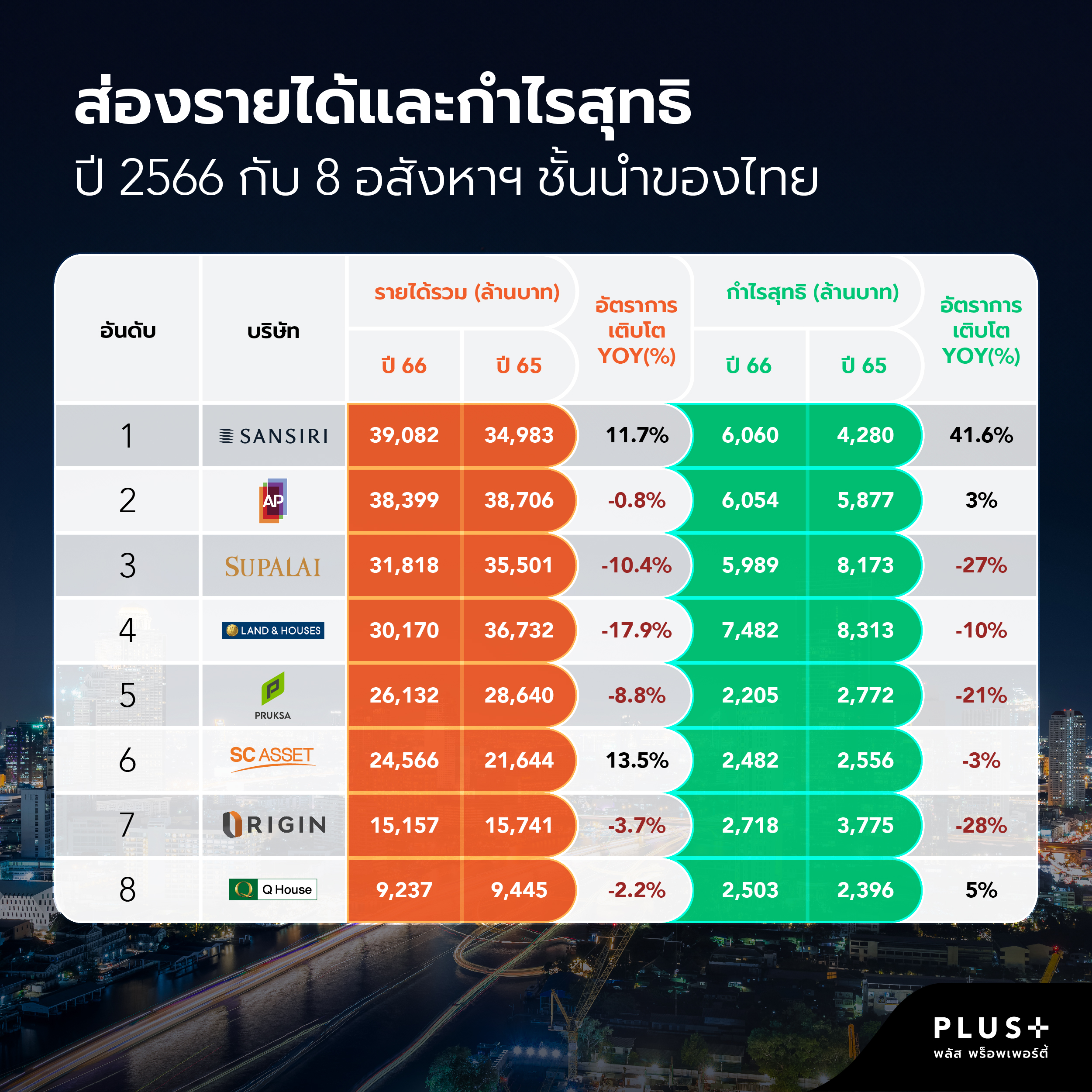พลัส พร็อพเพอร์ตี้ ระบุท่ามกลางเศรษฐกิจปี 2567 ที่มีความท้าทาย 8 ยักษ์ใหญ่ในธุรกิจอสังหาริมทรัพย์ไทยเผยผลประกอบการปี 2566 สุดอลังการ แสนสิริคว้าแชมป์ที่ 1 รายได้รวม ขณะที่แลนด์แอนด์เฮ้าส์ทำกำไรสุทธิสูงสุด สะท้อนกลยุทธ์ที่แตกต่าง นอกจากนี้ หากพิจารณาในแง่ของการลงทุนผ่านหุ้นอสังหาฯ ทั้ง 8 บริษัท มีอัตรา Dividend Yield ที่ดี อยู่ที่ 6-11% นำโดยแสนสิริ (11%)