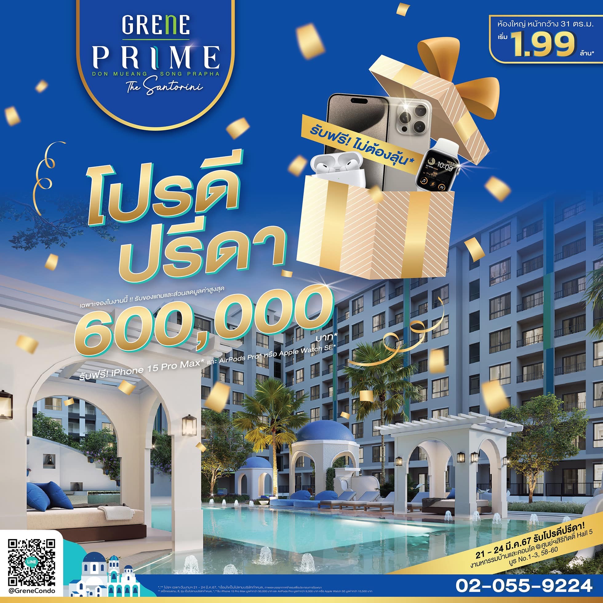 และยังมีไฮไลต์ที่น่าสนใจจาก “Grene Prime ดอนเมือง-สรงประภา” คอนโดมิเนียมแต่งครบ พร้อมเข้าอยู่ ภายใต้แนวคิดใช้ชีวิตส่วนตัวสไตล์ The Santorini นำเสอในราคาสุดพิเศษเริ่มต้น 1.99 ล้านบาท ด้วยห้องใหญ่หน้ากว้าง ขนาดห้อง 31 ตารางเมตร บนทำเลศักยภาพห่างจากสนามบินดอนเมืองเพียง 5 นาที ตอบโจทย์กลุ่มซื้อเพื่อปล่อยเช่าสำหรับรองรับกลุ่มคนทำงานด้านการท่องเที่ยวที่กำลังเติบโตต่อ และพิเศษสำหรับผู้ที่จองซื้อภายในงานยังได้รับโปรโมชั่นฟรีทุกค่าใช้จ่ายวันโอน*