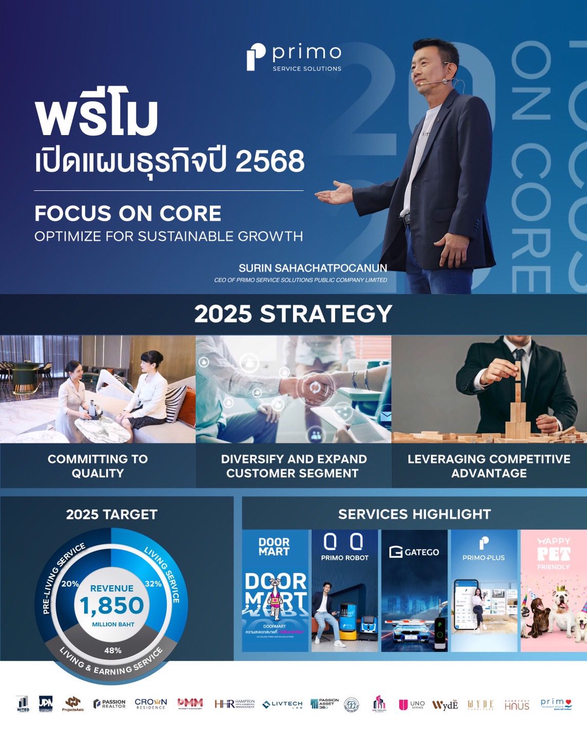 นายสุรินทร์ สหชาติโภคานันท์ ประธานเจ้าหน้าที่บริหาร บริษัท พรี โม เซอร์วิส โซลูชั่น จำกัด (มหาชน) หรือ PRI ผู้นำธุรกิจบริการที่เกี่ยวเนื่องกับอสังหาริมทรัพย์สมัยใหม่แบบครบวงจร เปิดเผยว่า ในฐานะผู้นำธุรกิจบริการด้านอสังหาริมทรัพย์สมัยใหม่แบบครบวงจร บริษัทเดินหน้าขับเคลื่อนธุรกิจในปี 2568 นี้ ภายใต้แนวคิด “Focus On Core” Optimize for Sustainable Growth มุ่งเน้นในการสร้างความเข้มแข็งเพื่อการเติบโตอย่างยั่งยืน ภายใต้ 3 กลยุทธ์หลัก ได้แก่”