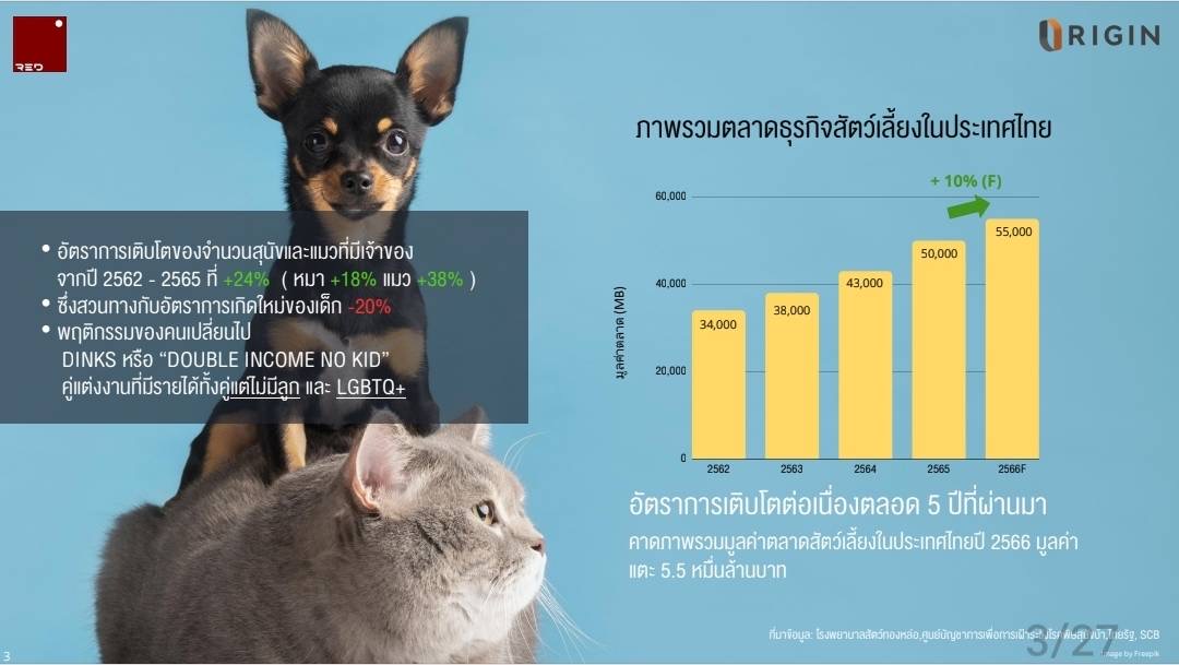 โดยเฉพาะการเลี้ยงสุนัขและแมวของครอบครัวคนรุ่นใหม่เกิดขึ้นทั่วโลก ขณะที่ในประเทศไทยช่วงปี 2562-2565 มีอัตราการเติบโตของจำนวนสุนัข และแมวที่มีเจ้าของอยู่ที่ 24% แบ่งเป็นแมวมีอัตราการเติบโตกว่า 38% และสุนัขเติบโต 18% ทั้งนี้การเติบโตดังกล่าวมาจากพฤติกรรมของคนรึ่นใหม่ที่เปลี่ยนไป โดยมีกลุ่มคนที่เรียกว่า Sinks (Single Income No Kid) หรือคนที่ใช้ชีวิตโสด มีความเหงา ต้องการมีสัตว์เลี้ยงไว้เป็นเพื่อน Dinks (Double Income No Kid) คนที่แต่งงานแล้วมีรายได้ทั้งคู่แต่ไม่มีลูก รวมถึงกลุ่ม LGBTQ+ ซึ่งทั้งหมดเป็นรูปแบบครอบครัวที่มีขนาดเล็กลง และมีสัตว์เลี้ยงไว้เป็นหนึ่งในสมาชิกของครอบครัว ซึ่งส่วนใหญ่เลี้ยงไว้เหมือนเป็นลูก รองลงมาเป็นการเลี้ยงสัตว์เพื่อแสดงสถานะทางสังคม และกลุ่มที่ให้ความช่วยเหลือดูแล