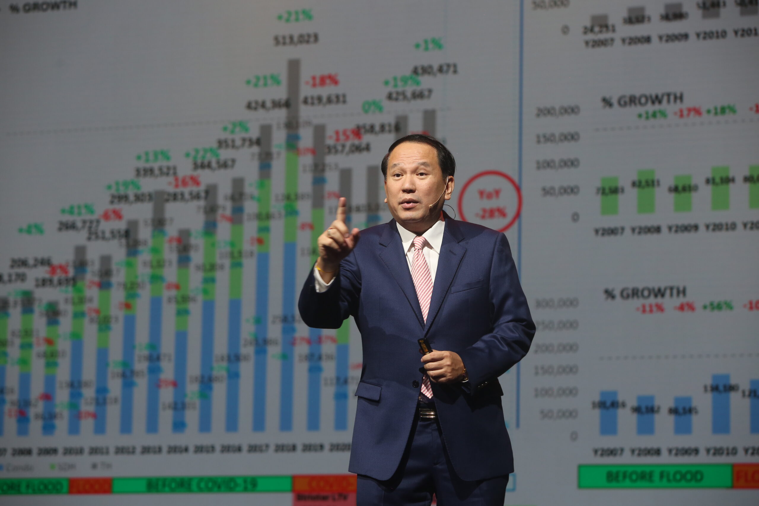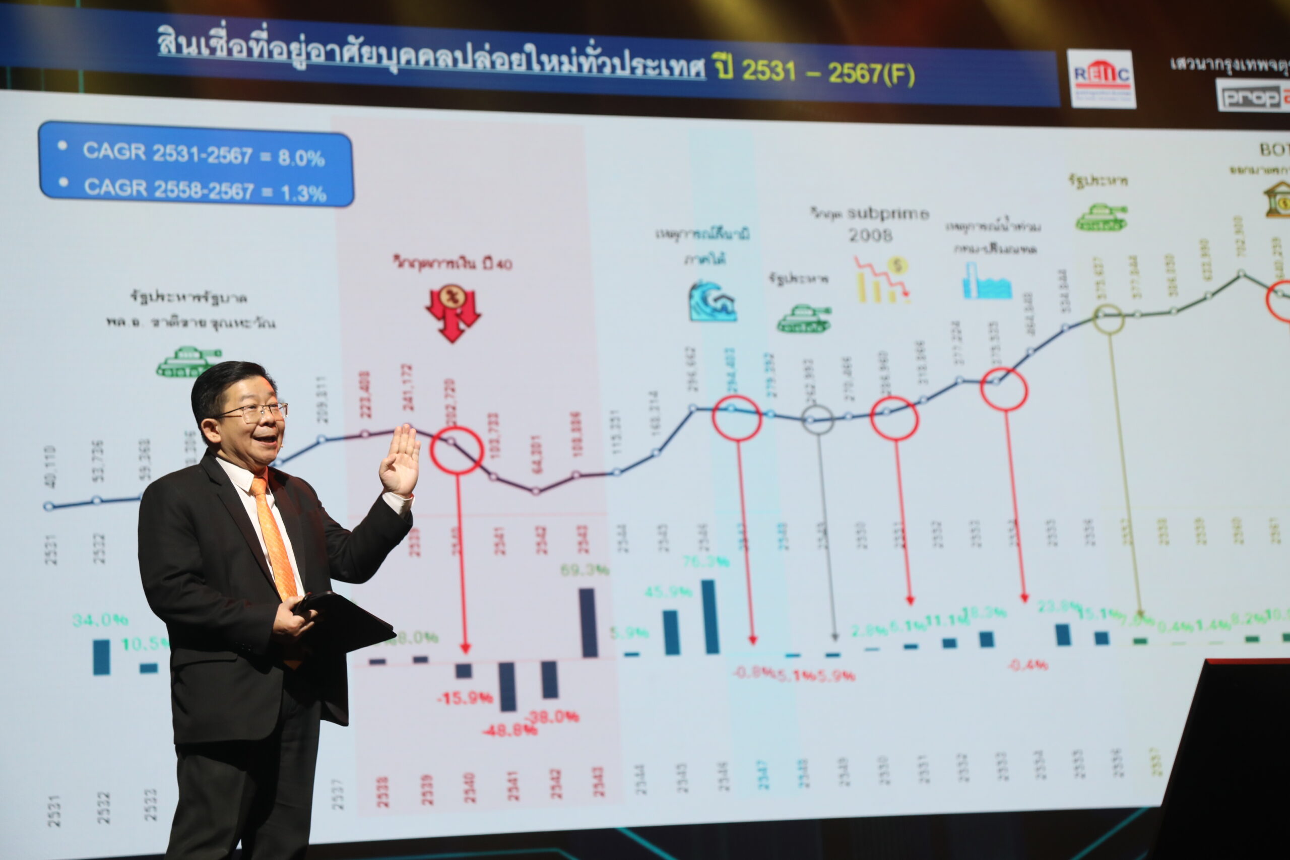 ดร.วิชัย วิรัตกพันธ์ รักษาการผู้อำนวยการ ศูนย์ข้อมูลอสังหาริมทรัพย์ (REIC) ได้ฉายภาพตลาดที่อยู่อาศัยช่วง 30 ปี ที่ผ่านมา ตั้งแต่ช่วงก่อนเกิดวิกฤติฟองสบู่แตกปี 2540 ว่า ตลาดที่อยู่อาศัยอยู่ในยุครุ่งเรืองมีบ้านและคอนโดมิเนียมสร้างเสร็จจดทะเบียนในเขตพื้นที่กรุงเทพฯ-ปริมณฑลสูงถึงปีละ 150,000-170,000 ยูนิต แต่ช่วงที่เกิดวิกฤติต้มยำกุ้งปี 2540 ตลาดอสังหาฯชะลอตัวอย่างรุนแรง ทำให้จำนวนที่อยู่อาศัยถูกพัฒนาขึ้นมาให้สอดคล้องกับดีมานด์ความต้องการคนไทย ด้วยยอดจดทะเบียนต่อปีประมาณ 30,000 – 40,000 ยูนิต ในช่วง 5 ปีหลัง (2542-2546) และกลับมาอยู่ในระดับ 106,969 ยูนิต อีกครั้งในปี 2553 ตามการขยายตัวของเมืองและการลงทุนใหม่ ก่อนที่จะเริ่มชะลอตัวอีกครั้งช่วงวิกฤติน้ำท่วมใหญ่ในปี 2554 ลดลงมาอยู่ที่ระดับ 80,000 ยูนิตต่อปี