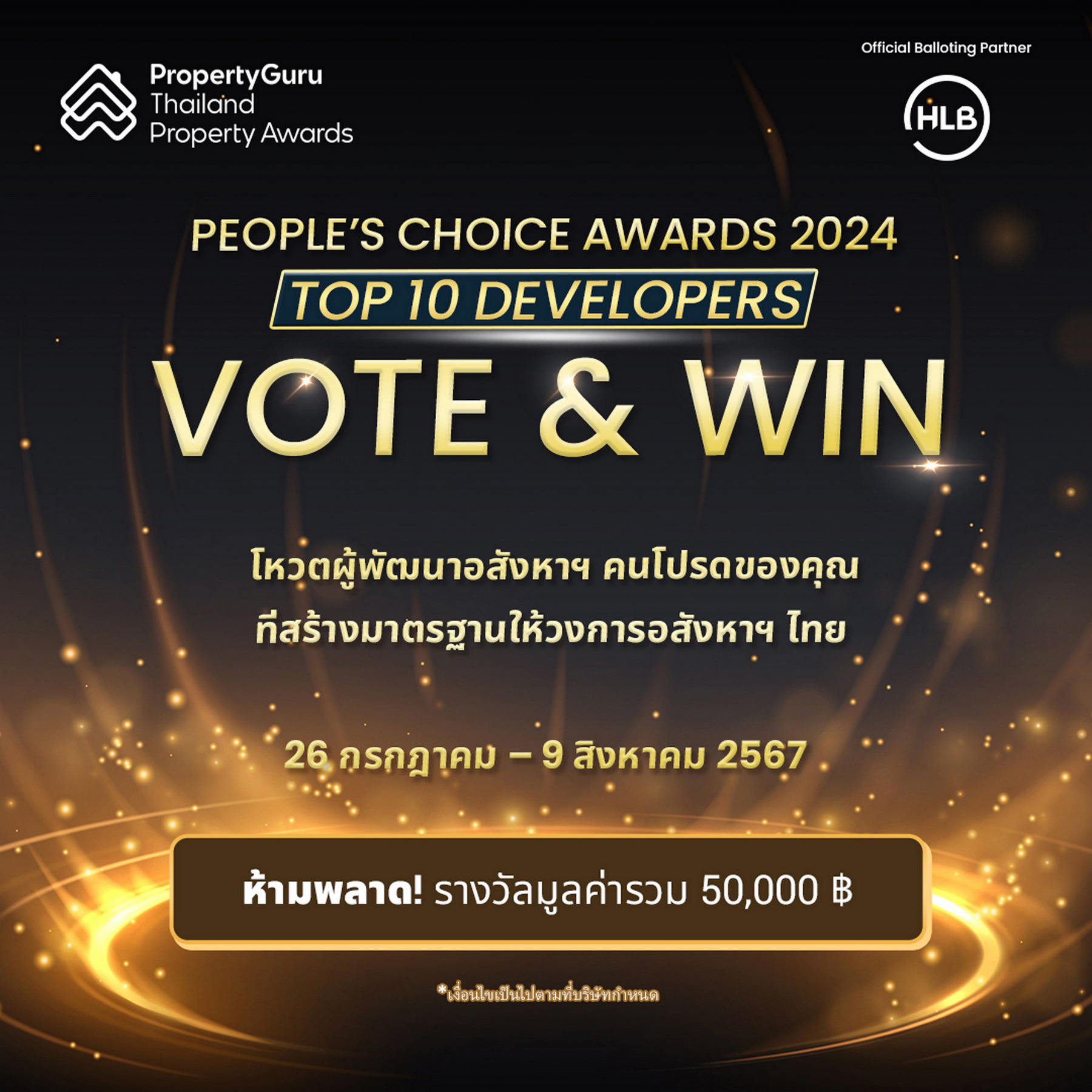 การลงคะแนนโหวตสำหรับรางวัล People’s Choice Awards จะเริ่มเวลาเที่ยงคืน วันที่ 26 กรกฎาคม 2567 นี้ ถึงวันที่ 9 สิงหาคม 2024 เวลา 23:59 น. ผู้สนใจสามารถโหวตให้กับผู้พัฒนาโครงการอสังหาฯ ที่ได้รับการเสนอชื่อเข้าชิง ซึ่งได้รับการคัดเลือกมาจากคุณภาพของโครงการ ชื่อเสียงของแบรนด์ และความพึงพอใจของผู้บริโภค