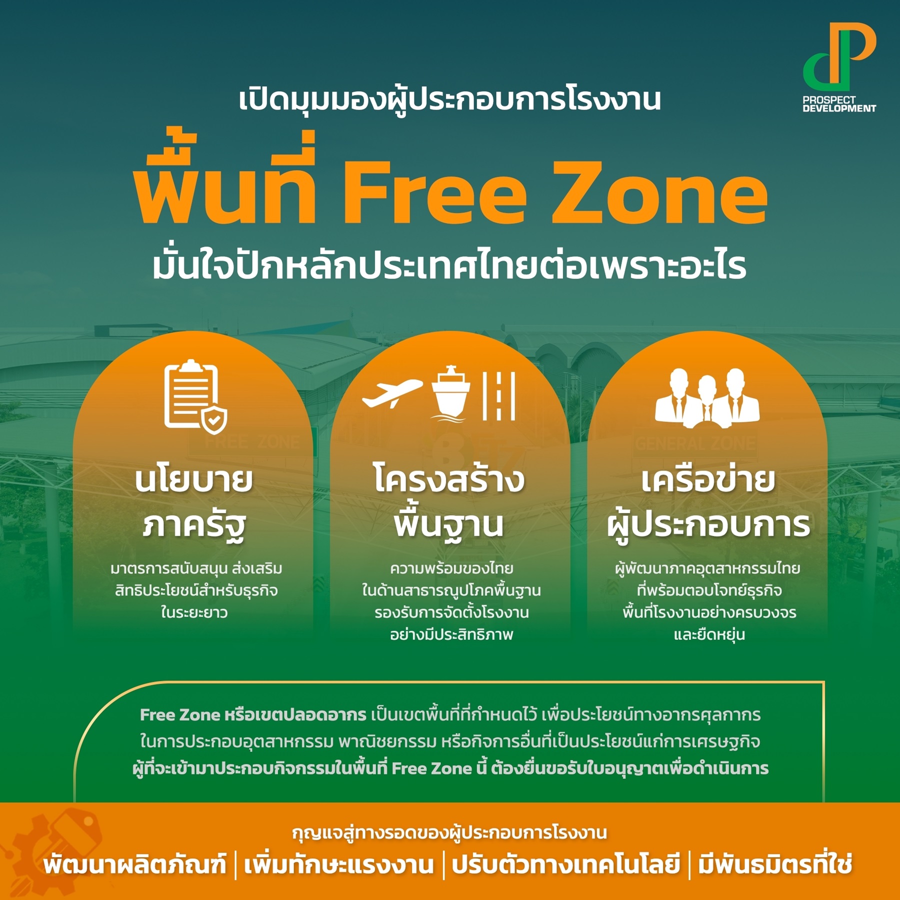 การยกระดับศักยภาพ ปรับตัวให้พร้อมรับกับทุกการเปลี่ยนแปลงและจับมือกับพันธมิตรที่แข็งแกร่ง เป็นหนทางในการขับเคลื่อนไปข้างหน้า เผชิญทุกแรงต้านอย่างมั่นคง แนวคิดดังกล่าวคือภาพสะท้อนจากเส้นทางแห่งพัฒนาการของเหล่าผู้ประกอบการโรงงานในพื้นที่ Free Zone สู่การสร้างอนาคตที่แข็งแกร่งแก่ภาคอุตสาหกรรมของไทยในระยะยาว