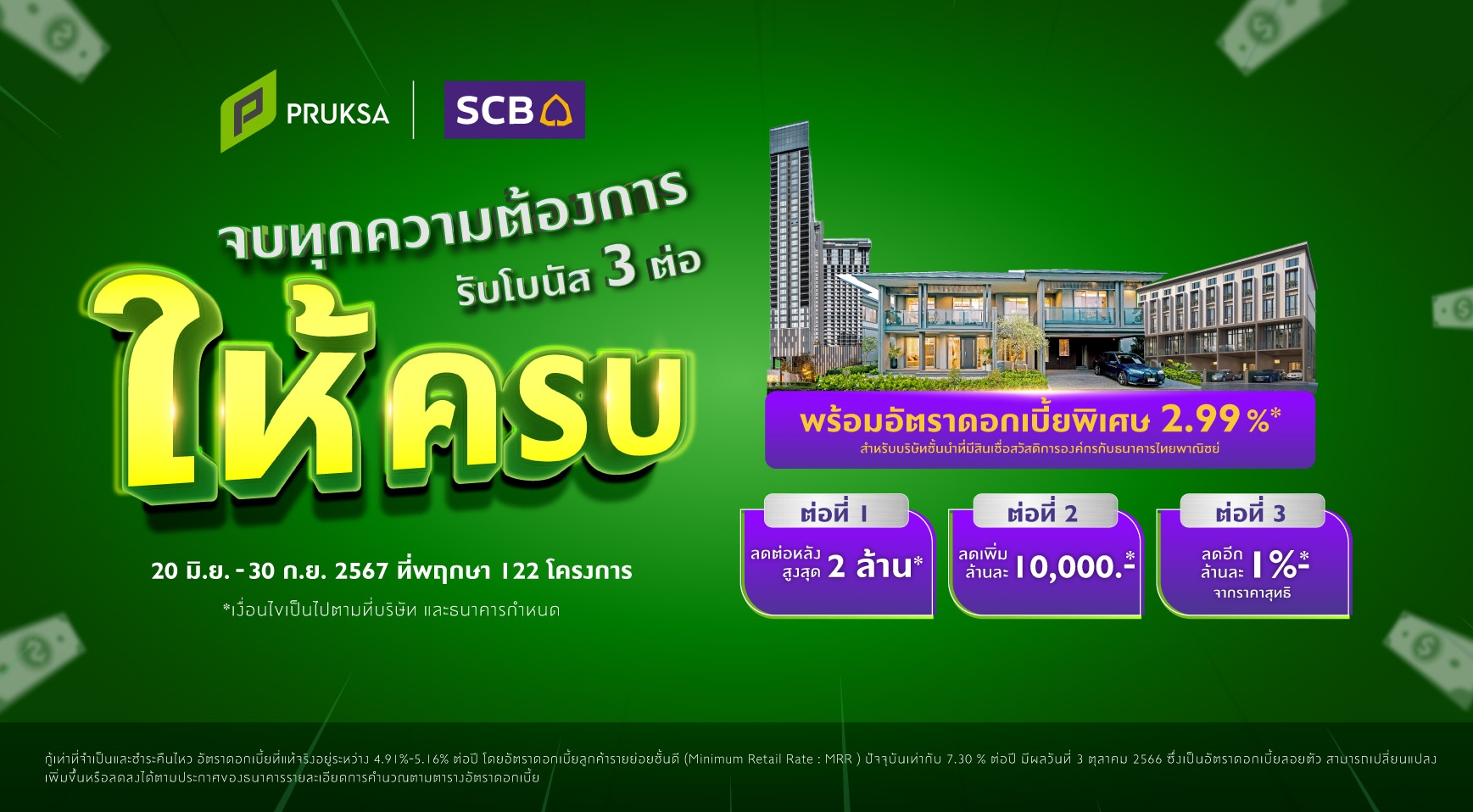 “พฤกษา” จับมือแบงก์พันธมิตร “ธนาคารไทยพาณิชย์” ลุยจัดแคมเปญเจาะกลุ่มลูกค้า 20 บริษัทที่มีสวัสดิการองค์กรกับธนาคารไทยพาณิชย์ มอบสิทธิประโยชน์แบบจัดเต็มจากพฤกษา และ ธนาคารไทยพาณิชย์ โดยพฤกษาให้สิทธิพิเศษถึง 3 ต่อ ทั้งส่วนลดและโปรโมชันรายโครงการ ส่วนลดพิเศษสำหรับพนักงานบริษัทพันธมิตร ล้านละ 10,000 บาท และ On Top เพิ่มเติมส่วนลดพิเศษ ตามประเภทโครงการ ในขณะที่ธนาคารไทยพาณิชย์ มอบดอกเบี้ยอัตราพิเศษคงที่ 2.99% ต่อปี นาน 3 ปี* วงเงินกู้สูงสุดถึง 110%** เมื่อซื้อบ้านในโครงการของพฤกษาที่ยกทัพมาให้เลือกทั้งทาวน์เฮาส์ บ้านเดี่ยว และคอนโดมิเนียม รวม 122 โครงการ ตั้งแต่วันที่ 20 มิถุนายน – 30 กันยายน 2567