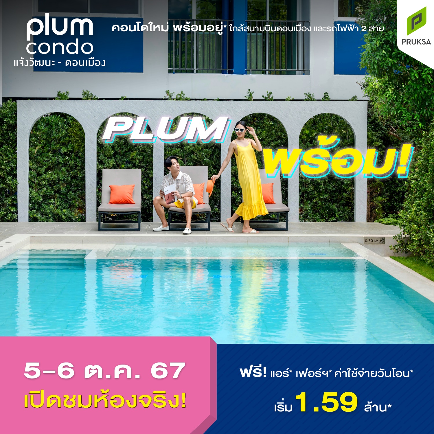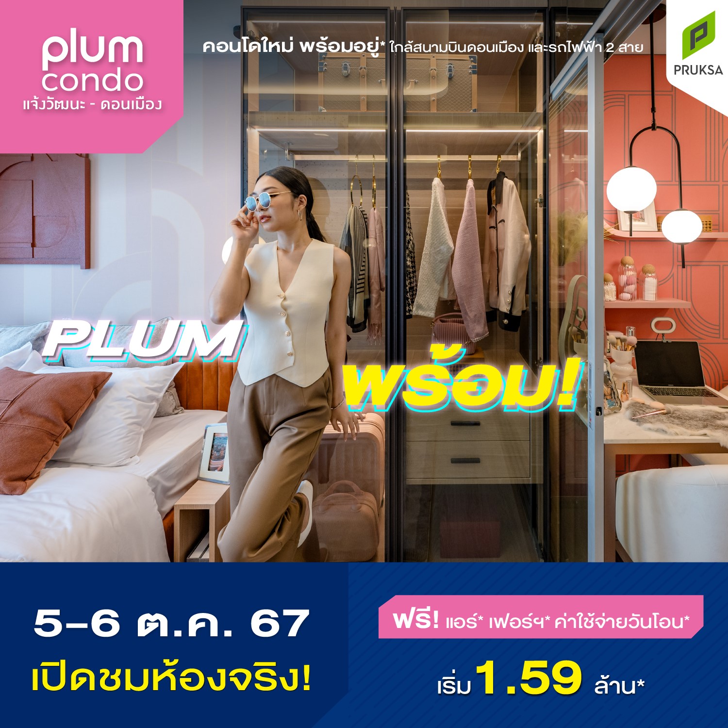 พลัม คอนโด แจ้งวัฒนะ-ดอนเมือง เป็นคอนโด Low-Rise 8 ชั้น 2 อาคาร แต่ละอาคารมีจำนวนยูนิตน้อยเพื่อความเป็นส่วนตัว เปิดให้ผู้สนใจชมห้องจริง โครงการจริง ครั้งแรก ในวันที่ 5-6 ตุลาคม 2567 ในราคาที่จับต้องง่าย เริ่มต้นเพียง 1.59 ล้านบาท พร้อมโปรโมชันพิเศษ จองเพียง 999 บาท รับของแถมฟรี 15 รายการ อาทิ แอร์ เฟอร์นิเจอร์ ค่าใช้จ่ายวันโอน โดยมีห้องให้เลือกตั้งแต่ขนาด 22.35–34.80 ตร.ม และพร้อมให้เข้าอยู่ได้ในเดือนพฤศจิกายน 2567