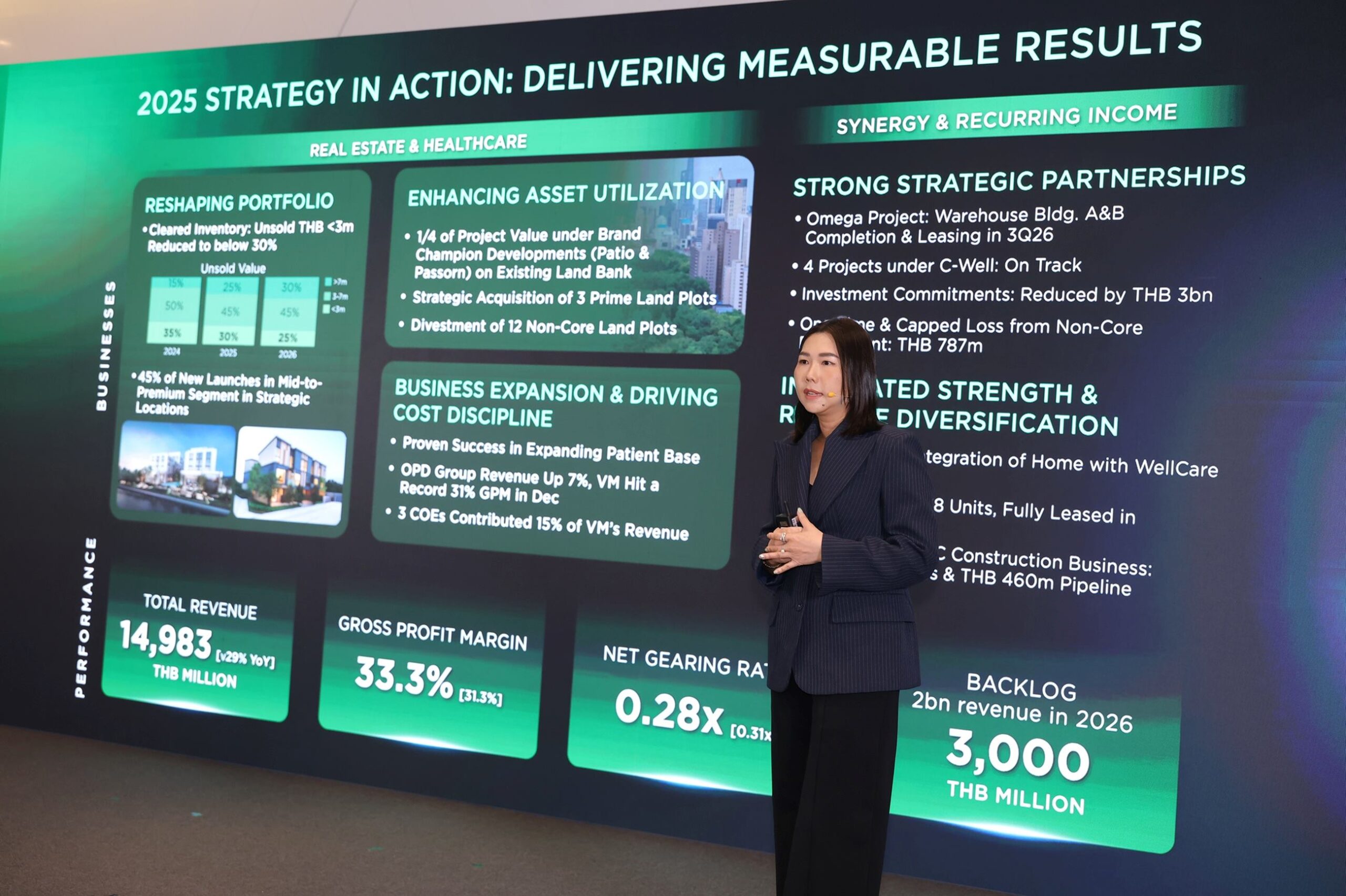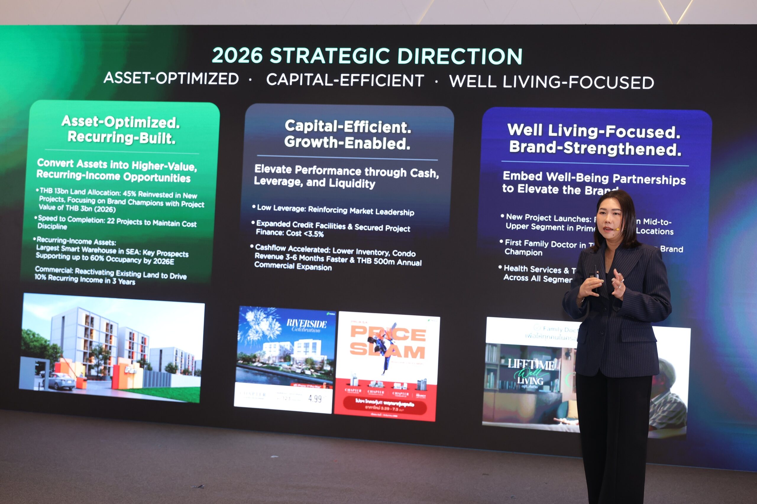 ในมิติแรก “Asset-Optimized, Recurring-Built” บริษัทฯ เดินหน้ากลยุทธ์เชิงรุกเพื่อเพิ่มสัดส่วนรายได้ประจำ (Recurring Income) ผ่านการบริหารจัดการพอร์ตที่ดินมูลค่ากว่า 12,800 ล้านบาท เปลี่ยนสินทรัพย์ให้เป็นรายได้ผ่านการพัฒนาโครงการที่อยู่อาศัยและการสร้างรายได้จากการเช่ารูปแบบใหม่ ๆ อาทิ กลุ่มเฮลท์แคร์, อะพาร์ตเมนต์, ไฮบริด เรสซิเด้นท์ และคลังสินค้า พร้อมกันนี้ บริษัทฯ ได้วางโรดแมปเร่งสปีดการพัฒนาและการโอนกรรมสิทธิ์ โดยตั้งเป้าปิดโครงการรวม 22 โครงการ เพื่อเพิ่มประสิทธิภาพการบริหารจัดการต้นทุนและลดภาระในการดูแลสินค้าคงคลังอย่างเป็นระบบ สำหรับความคืบหน้าในธุรกิจคลังสินค้า “โอเมก้า บางนา โลจิสติกส์ แคมปัส” ซึ่งเป็นคลังสินค้าอัจฉริยะบนพื้นที่กว่า 217,000 ตารางเมตร ที่ถือเป็นหนึ่งในคลังสินค้าขนาดใหญ่ที่สุดในภูมิภาคเอเชียตะวันออกเฉียงใต้ โดยพัฒนาร่วมกับพันธมิตรระดับโลก เพื่อรองรับศักยภาพด้าน โลจิสติกส์ การกระจายสินค้า และสอดรับกับแนวโน้มเศรษฐกิจยุคใหม่ บริษัทฯ จะเริ่มรับรู้รายได้ในไตรมาส 3 พร้อมได้รับความเชื่อมั่นจากพันธมิตรรายใหญ่ในกลุ่มโลจิสติกส์และอีคอมเมิร์ช โดยคาดว่าจะมียอดจองพื้นที่กว่า 60% ขณะเดียวกันบริษัทฯ ได้นำที่ดินจากพอรต์ที่มีอยู่มาพัฒนาโครงการ และเพิ่มสัดส่วนบ้านในเซ็กเมนต์กลางถึงบน เพื่อสร้างกระแสเงินสดหมุนเวียน สำหรับรองรับการขยายตัวของธุรกิจในอนาคตได้อย่างมีประสิทธิภาพ