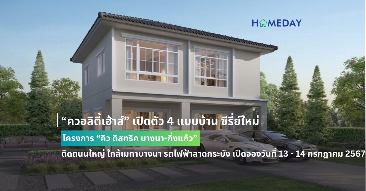 “ควอลิตี้เฮ้าส์” เปิดตัว 4 แบบบ้าน ซีรี่ย์ใหม่ โครงการ “คิว ดิสทริค บางนา-กิ่งแก้ว” ติดถนนใหญ่ ใกล้เมกาบางนา รถไฟฟ้าลาดกระบัง เปิดจองวันที่ 13 – 14 กรกฎาคม 2567 ราคา 2.6 – 10 ล้านบาท* รับส่วนลด 100,000 บ.* เฉพาะวันงาน - Homeday Space | HOMEDAY