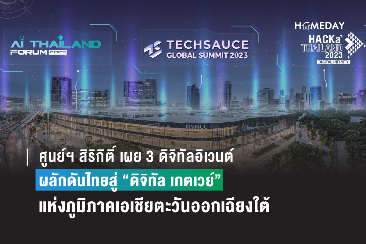 ศูนย์การประชุมแห่งชาติสิริกิติ์ ต้อนรับ 3 ดิจิทัลอิเวนต์ในเดือนสิงหาคมหนุนแลกเปลี่ยนความรู้ และเชื่อมโยงผู้คนในอุตสาหกรรมดิจิทัล สู่การขับเคลื่อนเศรษฐกิจดิจิทัลไทยโตทั้งระบบ นำโดยงานประชุมด้านเทคโนโลยีที่ใหญ่ที่สุดแห่งปีของภูมิภาคเอเชียตะวันออกเฉียงใต้ “Techsauce Global Summit 2023” มหกรรมเทคโนโลยีปัญญาประดิษฐ์ ครั้งแรกของไทย “AI Thailand Forum 2023: Embracing The Future of AI” และมหกรรมแสดงเทคโนโลยีดิจิทัล ที่สุดของขุมพลังดิจิทัล “HACKaTHAILAND 2023: DIGITAL INFINITY” พร้อมเป็นศูนย์กลางเชื่อมภาครัฐ และเอกชนด้วย “ที่สุดของอิเวนต์แพลตฟอร์ม” เพื่อผลักดันศักยภาพไทยสู่ “ดิจิทัล เกตเวย์” (Digital Gateway) ของภูมิภาคเอเชียตะวันออกเฉียงใต้