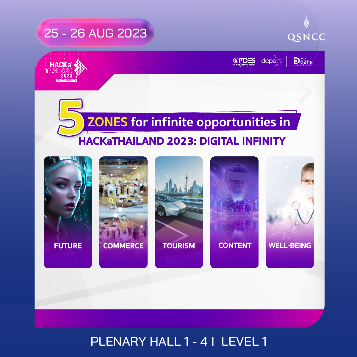 • HACKaTHAILAND 2023 จัดขึ้นในวันที่ 25 – 26 สิงหาคม โดยสำนักงานส่งเสริมเศรษฐกิจดิจิทัล (DEPA) ภายใต้แนวคิด Digital Infinity ด้วย 5 โซนไฮไลต์ ที่ครอบคลุม ‘Tech Showcase’ รวบรวมเทคโนโลยีดิจิทัลที่ทันสมัยในยุคปัจจุบัน ทั้งด้าน Commerce, Tourism, Content และ Health tech