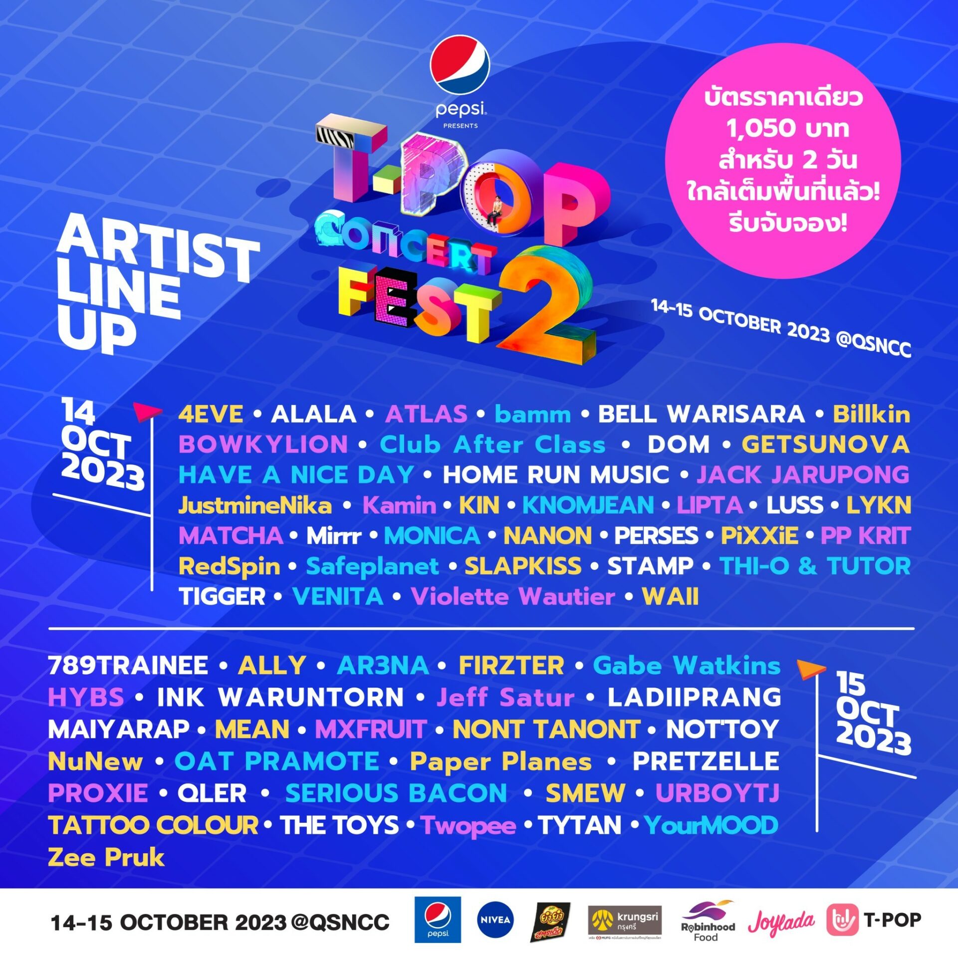 • PEPSI Presents T-POP Concert Fest 2 จัดขึ้นวันที่ 14 – 15 ตุลาคม 2566 เทศกาลดนตรีสุดป๊อป สุดยิ่งใหญ่ใจกลางเมือง ที่สะดวกสบายที่สุด จัดเต็มทัพศิลปิน T-POP กว่า 50 วง แบบไม่จำกัดค่ายตลอด 2 วัน