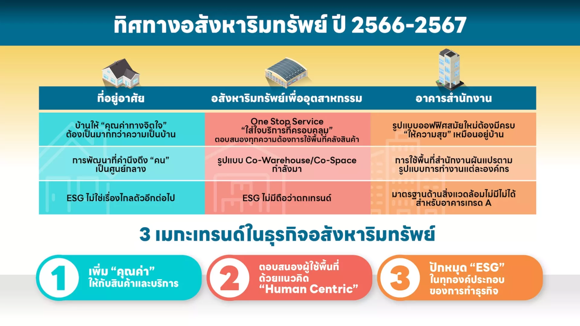 REDPAPER เปิด 3 เมกะเทรนด์ของธุรกิจอสังหาริมทรัพย์เพื่อการอยู่อาศัย อุตสาหกรรม และอาคารสำนักงาน ชี้ผู้พัฒนาอสังหาฯ ควรยกระดับสินค้าและบริการด้วยการเพิ่มคุณค่าใหม่ ๆ สอดรับกับไลฟ์สไตล์และความต้องการที่หลากหลาย พร้อมยึดแนวคิด Human Centric พัฒนาพื้นที่ด้วยความเข้าใจพฤติกรรมการที่แตกต่างกันของผู้ใช้งาน ควบคู่กับการนำ ESG เป็นแนวทางการดำเนินธุรกิจ เพื่อช่วยลดผลกระทบต่อสังคมและสิ่งแวดล้อม สร้างธุรกิจให้เติบโตอย่างแข็งแกร่งและยั่งยืน