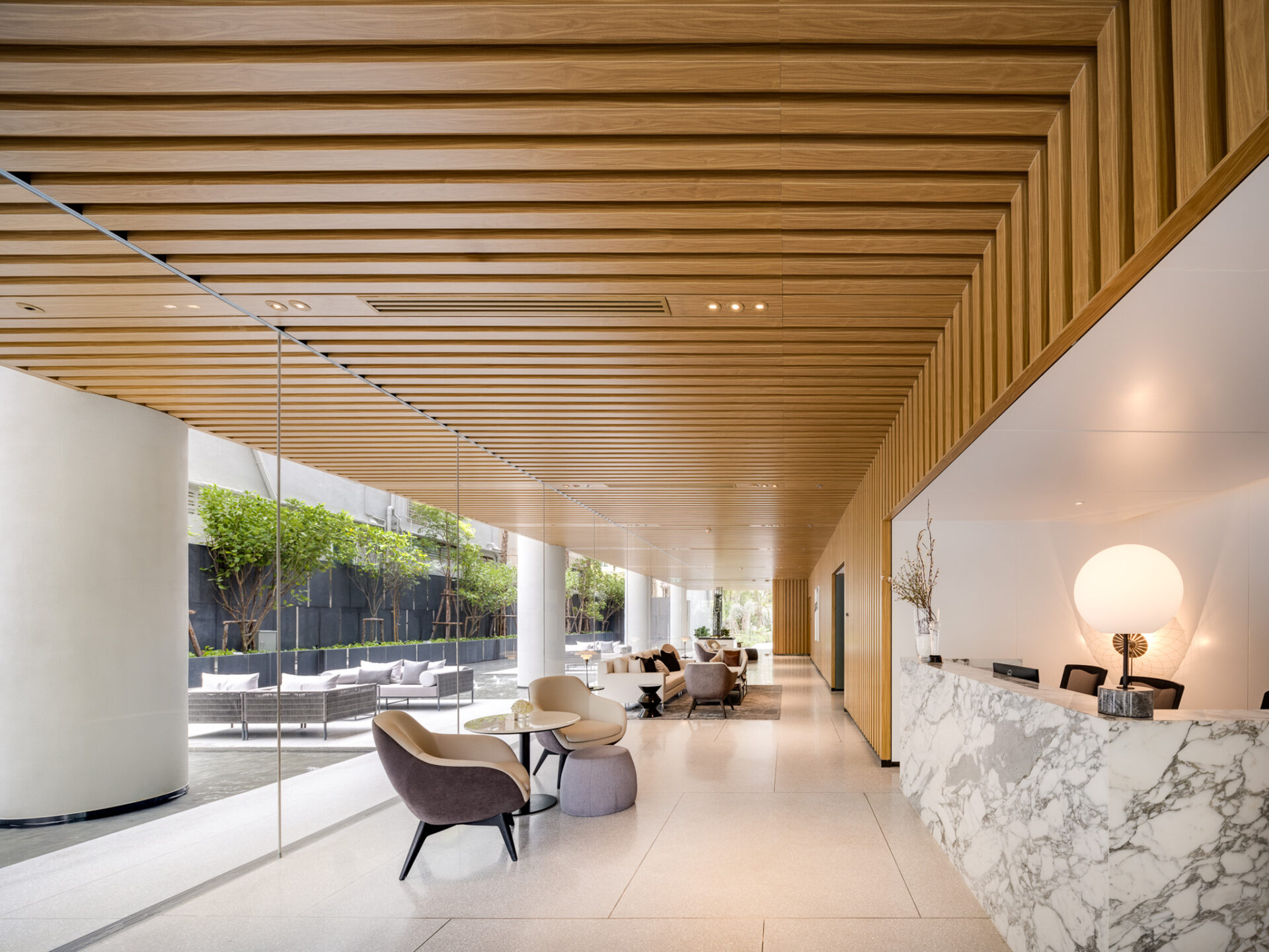 • ด้านหน้าโครงการ บริเวณล็อบบี้ โครงการมี Outdoor Lobby ซึ่งเชื่อมต่อกับสวนด้านหน้าของโครงการ ให้ความรู้สึกเสมือนพักในโรงแรม