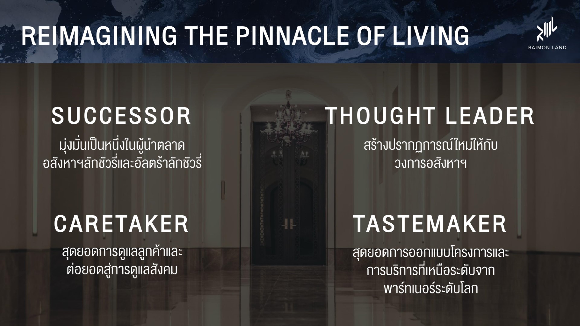 สำหรับแนวคิด ‘REIMAGINING THE PINNACLE OF LIVING’ มุ่งเน้นใน 4 ด้าน ดังต่อไปนี้