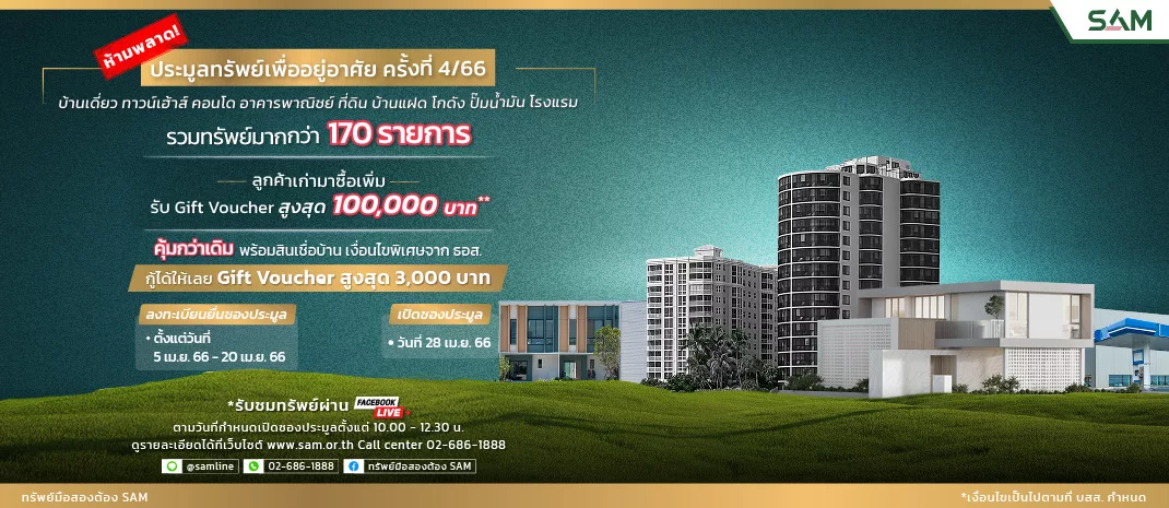 ผู้สนใจเข้าร่วมประมูล สามารถลงทะเบียนและยื่นซองประมูล พร้อมเอกสารประกอบการประมูล ภายในวันพฤหัสบดีที่ 20 เมษายน 2566 กำหนดเปิดซองประมูลวันศุกร์ที่ 28 เมษายน 2566 เวลา 10.00 น.เป็นต้นไป ณ สำนักงานใหญ่ SAM อาคารซันทาวเวอร์ส ถ.วิภาวดีรังสิต กรุงเทพฯ สอบถามรายละเอียดเพิ่มเติมได้ที่ Call Center 02-686-1888 และดูรายละเอียดทรัพย์สินได้ทางเว็บไซต์ที่ www.sam.or.th รวมทั้งช่องทางออนไลน์ที่หลากหลายและสะดวกรวดเร็ว โดยแอด ID Line @Samline ติดตาม Facebook Fanpage ทรัพย์มือสองต้อง SAM หรือ SAM NPA Channel บน YouTube เพื่อติดตามข้อมูลข่าวสารดี ๆ จาก SAM
