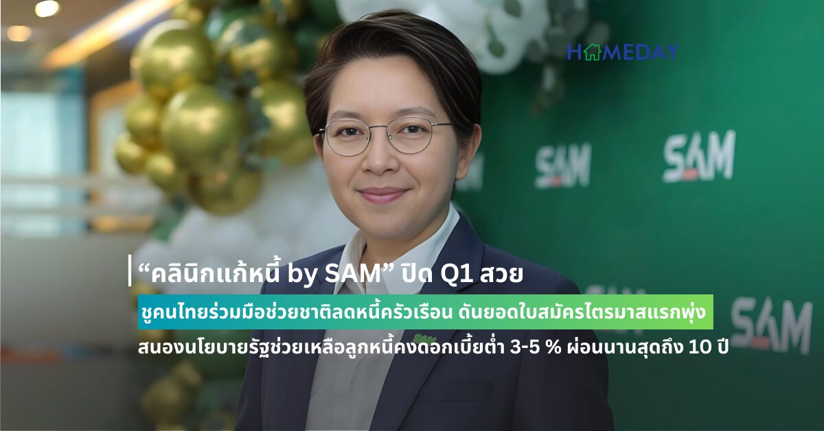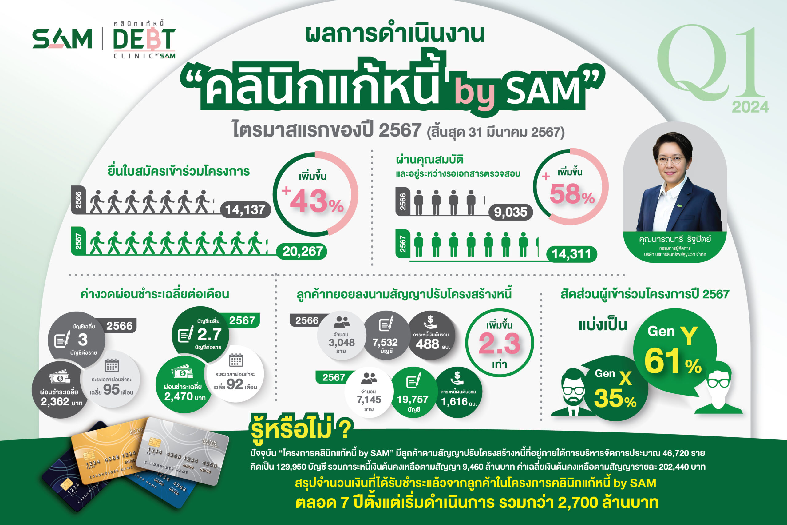 “ความสำเร็จของ “โครงการคลินิกแก้หนี้ by SAM” ดังกล่าว เป็นผลมาจากความร่วมมือกันระหว่างธนาคารแห่งประเทศไทย (ธปท.) รวมทั้งสถาบันการเงินต่างๆ ที่เข้าร่วมโครงการกว่า 32 แห่งในการปรับเกณฑ์คุณสมบัติใหม่ให้กับลูกค้าที่มีสถานะเป็นหนี้เสีย (NPL) บัตรเครดิต บัตรกดเงินสดและสินเชื่อส่วนบุคคลที่ไม่มีหลักประกัน ค้างชำระเกินกว่า 120 วัน (ตามรายงานเครดิตบูโร ณ เดือนปัจจุบันมีสถานะค้างชำระตั้งแต่ 121-150 วัน ขึ้นไป) ให้สามารถเข้าร่วมโครงการคลินิกแก้หนี้ได้เลย โดยมีผลตั้งแต่วันที่ 1 พ.ค.ปี 66 ที่ผ่านมา จากเดิมที่ต้องกำหนดช่วงเวลาของการเป็นหนี้เสียในแต่ละช่วงเวลา ส่งผลให้ “โครงการคลินิกแก้หนี้ by SAM” สามารถช่วยเหลือผู้ที่เป็นหนี้เสียและผู้ที่ต้องการแก้ไขปัญหาหนี้เสียได้รวดเร็วขึ้น รวมไปถึงเงื่อนไขการผ่อนชำระและอัตราดอกเบี้ยที่ต่ำ รวมทั้งระยะเวลาการผ่อนชำระที่ยาวสูงสุดถึง 10 ปี ทำให้การแก้ไขปัญหาหนี้มีความเป็นไปได้มากขึ้น ขณะที่ประชาชนเองก็เกิดความตื่นตัวและหันมาให้ความสำคัญกับการแก้ไขหนี้สินของตัวเองมากขึ้น นับว่าปัจจัยเหล่านี้เป็นส่วนสำคัญที่ช่วยส่งเสริมการแก้ไขปัญหาหนี้ครัวเรือนของคนไทยให้ลดลงโดยเร็วและส่งผลให้จำนวนผู้สนใจสมัครเข้าร่วมโครงการฯ เพิ่มสูงขึ้น โดยปี 2567 นี้ คาดว่าจะมีจำนวนลูกค้าปรับโครงสร้างหนี้ร่วมกับโครงการฯ ได้ไม่น้อยกว่า 55,000 บัญชี