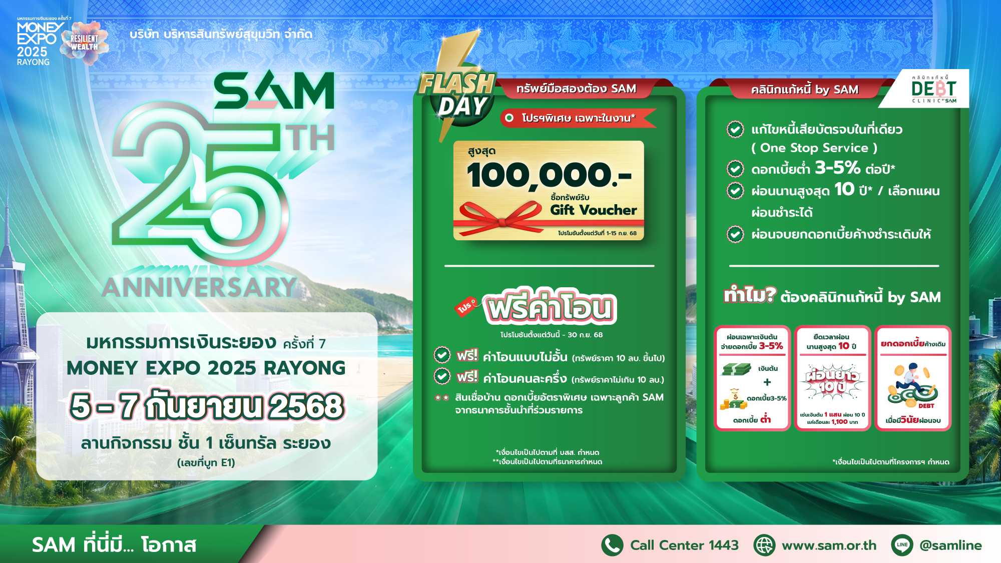 SAM ฉลองครบ 25 ปี รุกตลาด EEC ส่งมอบโอกาสเพื่อชาวภาคตะวันออก ขนทรัพย์มือสองทั้งเพื่อที่อยู่อาศัยและการลงทุนมากกว่า 4,500 รายการ พร้อมโปรฯเด็ด เข้าร่วมงาน “มันนี่ เอ็กซ์โป ระยอง” ณ เซ็นทรัล ระยอง 5-6 ก.ย.นี้ รวมถึงมาตรการพิเศษช่วยลูกค้า SAM แก้หนี้ NPL และแก้หนี้สารพัดบัตรกับ “คลินิกแก้หนี้ by SAM” - Homeday Space | HOMEDAY