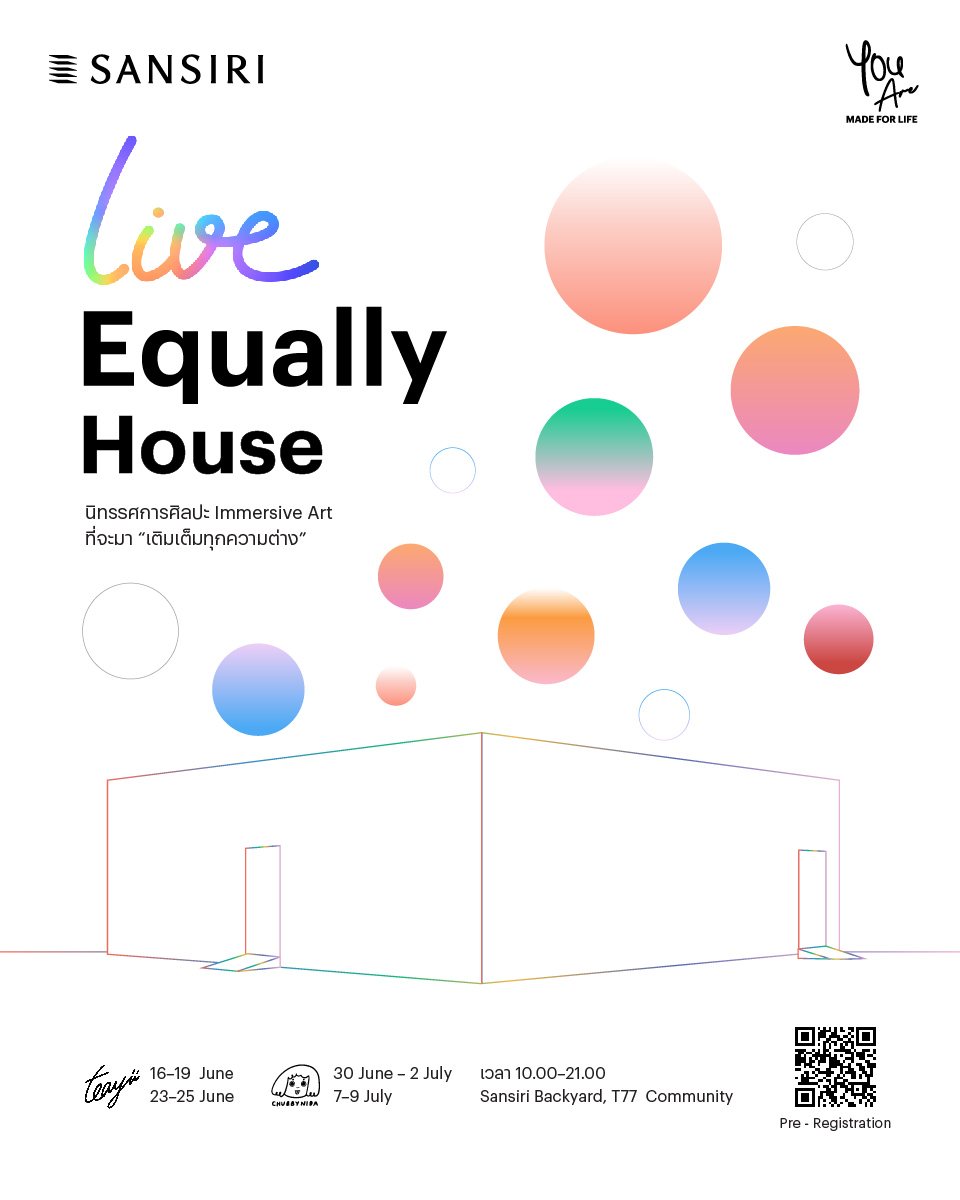 ร่วมค้นพบความหลากหลายที่รวมเป็นหนึ่งเดียว ในงานนิทรรศการห้องสีขาวใจกลางกรุง ที่พร้อมโอบรับทุกเฉดสี ‘SANSIRI : LIVE EQUALLY HOUSE’ กับประสบการณ์ Immersive Art Exhibition เติมเต็มทุกความต่าง…เพื่อความ เท่าเทียม สร้างสรรค์ผลงานโดย 2 ศิลปินรุ่นใหม่ Teayii (เตยยี่) และ Chubbynida (ชับบี้ นิดา) ที่จะมาสร้างพลังบวก ความหวัง และ แรงบันดาลใจ ให้ทุกคนได้ใช้ชีวิตในแบบต้องการ ผ่านมุมมองงานอาร์ต ทุกวันศุกร์ เสาร์ และอาทิตย์ วันที่ 16 มิ.ย.-9 ก.ค. นี้ เวลา 10.00–21.00น. ที่ แสนสิริ แบคยาร์ด, T77 Community คอมมูนีตี้สีเขียวต้นแบบแห่งแรกของวงการอสังหาฯ