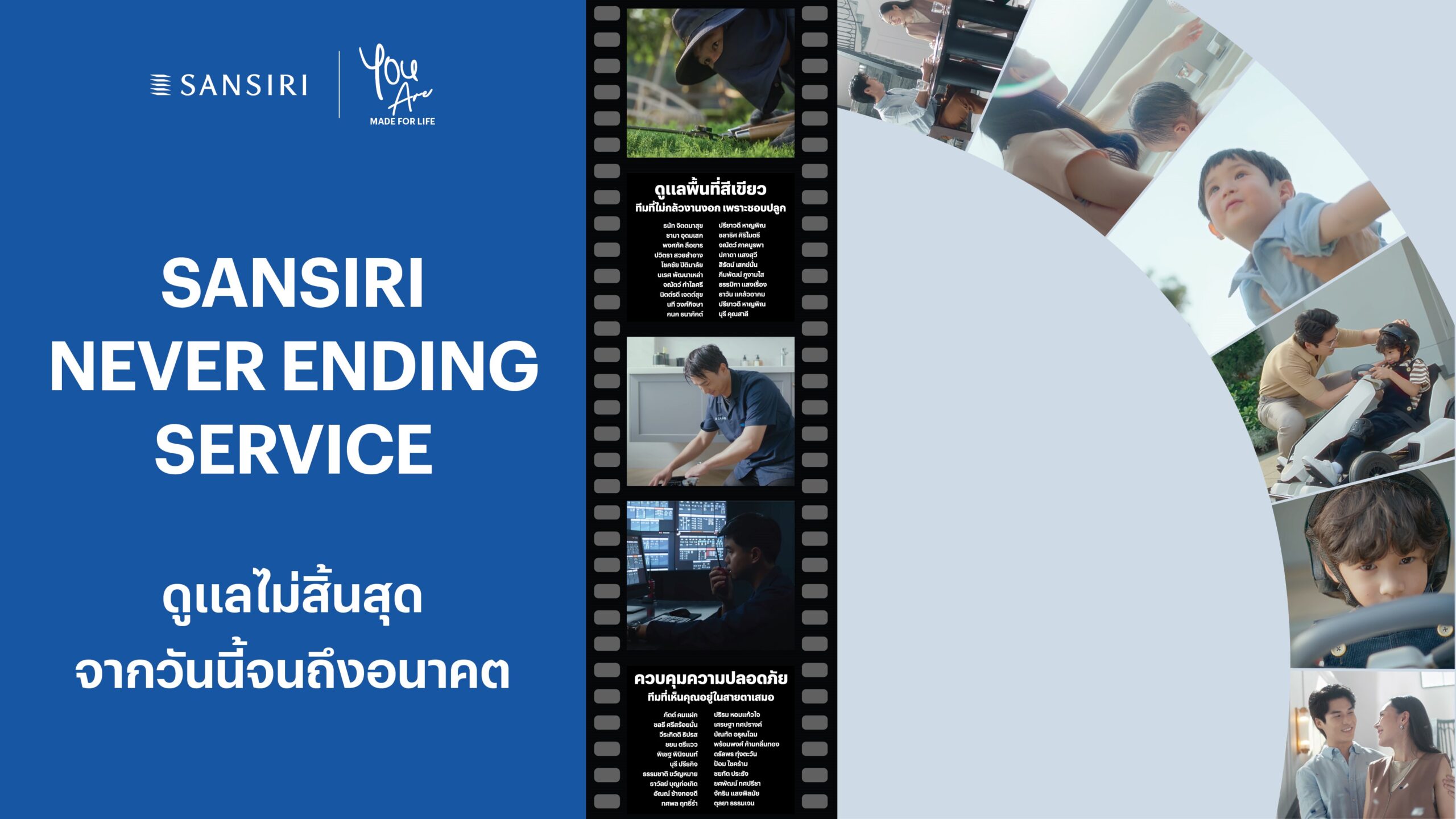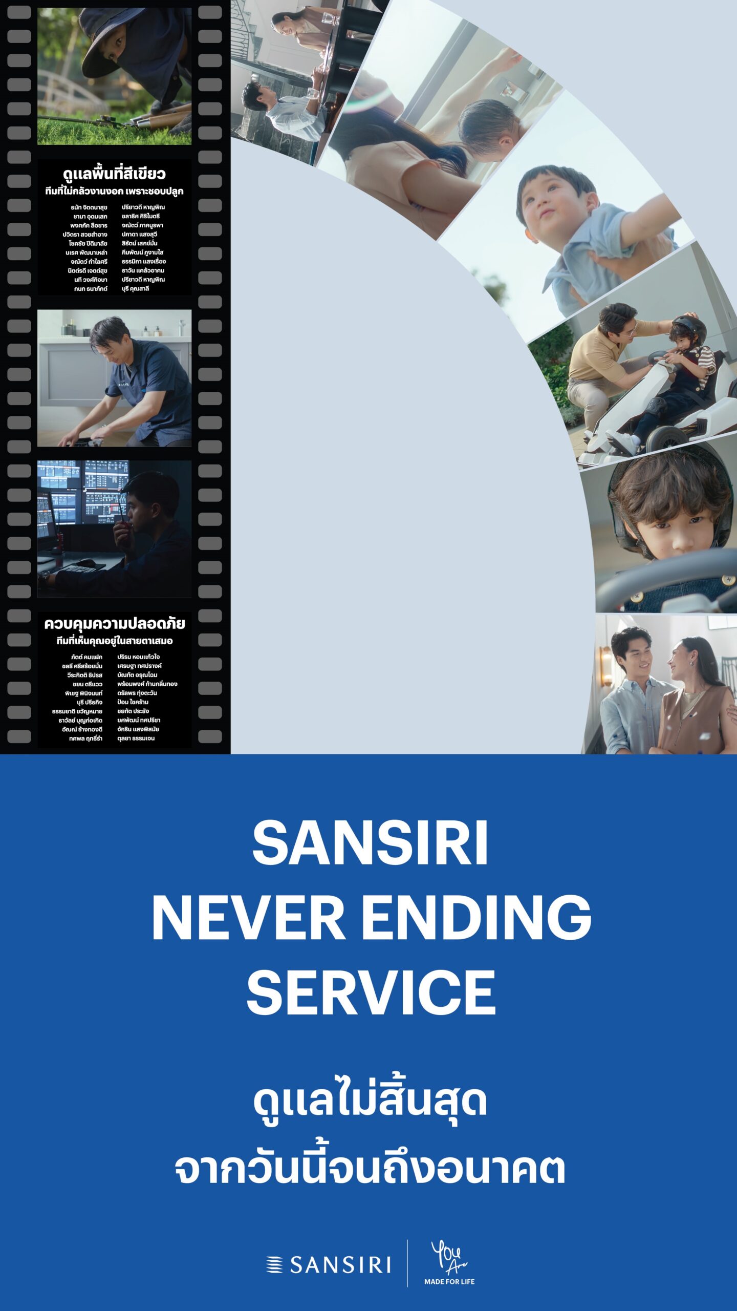 • ไฮไลท์ End Credit กับฮีโร่คนสำคัญ ทีมงานที่ดูแลฝ่ายคุณภาพและบริการหลายร้อยชีวิต ที่คอยอยู่เบื้องหลังทุกความสุขของลูกบ้าน ดูแล ใส่ใจเรื่องคุณภาพและการบริการอย่างไม่มีวันจบ และไม่ใช่แค่เรื่องบ้าน แต่รวมถึงการดูแลการใช้ชีวิตของครอบครัวแสนสิริจากวันนี้ไปจนถึงอนาคต