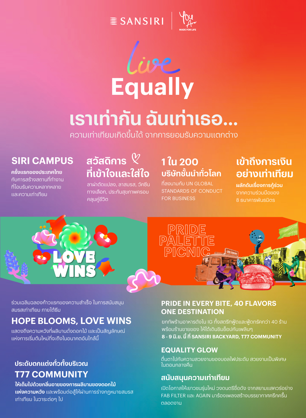 และกิจกรรมพิเศษที่เป็นอีกหนึ่งไฮไลต์ โดยแสนสิริจับมือกับพาร์ทเนอร์หลากหลาย เช่น ธนาคารไทยพาณิชย์ ธนาคารกรุงไทย บริษัท สยามไดกิ้นเซลส์ จํากัด บริษัท ทีโอเอ เพ้นท์ (ประเทศไทย) จำกัด (มหาชน) เพื่อร่วมเฉลิมฉลองเดือนแห่งความภาคภูมิใจ กับงาน “Pride Palette Picnic” ส่งเสริมความหลากหลาย ส่งต่อความสุขให้ทุกเพศทุกวัย ผ่านงานเทศกาลอาหารและสินค้า วันที่ 8 – 9 มิถุนายน 2567 เวลา 16.00 – 20.00 น. ที่ Sansiri Backyard, T77 Community โดยเอาใจสายกินในธีม “Pride in every bite, 40 Flavors One Destination” ยกทัพร้านดังใน IG อาหารสตรีทฟู้ด และฟู้ดทรัคชื่อดังกว่า 40 ร้าน กับอาหารหลากหลายประเภท ลิ้มลองรสชาติแปลกใหม่ พร้อมร้านขายของให้ได้เดินช็อปเพลินๆ กว่า 10 ร้าน ตลอดสองวันเต็ม พร้อมเสริมบรรยากาศ ด้วยการทาทางม้าลายเป็นสีรุ้ง และประดับตกแต่งทั่วทั้งบริเวณ T77 Community ด้วยดอกไม้ในธีม Love Wins รวมถึงการเปิดโอกาสให้เยาวชนรุ่นใหม่ วงดนตรีชื่อดังจากสยามแสควร์อย่าง Fab Filter และ Again ที่จะเข้ามาสร้างสีสัน ร้องเพลงสนุกๆ ให้ทุกคนตลอดทั้งงาน
