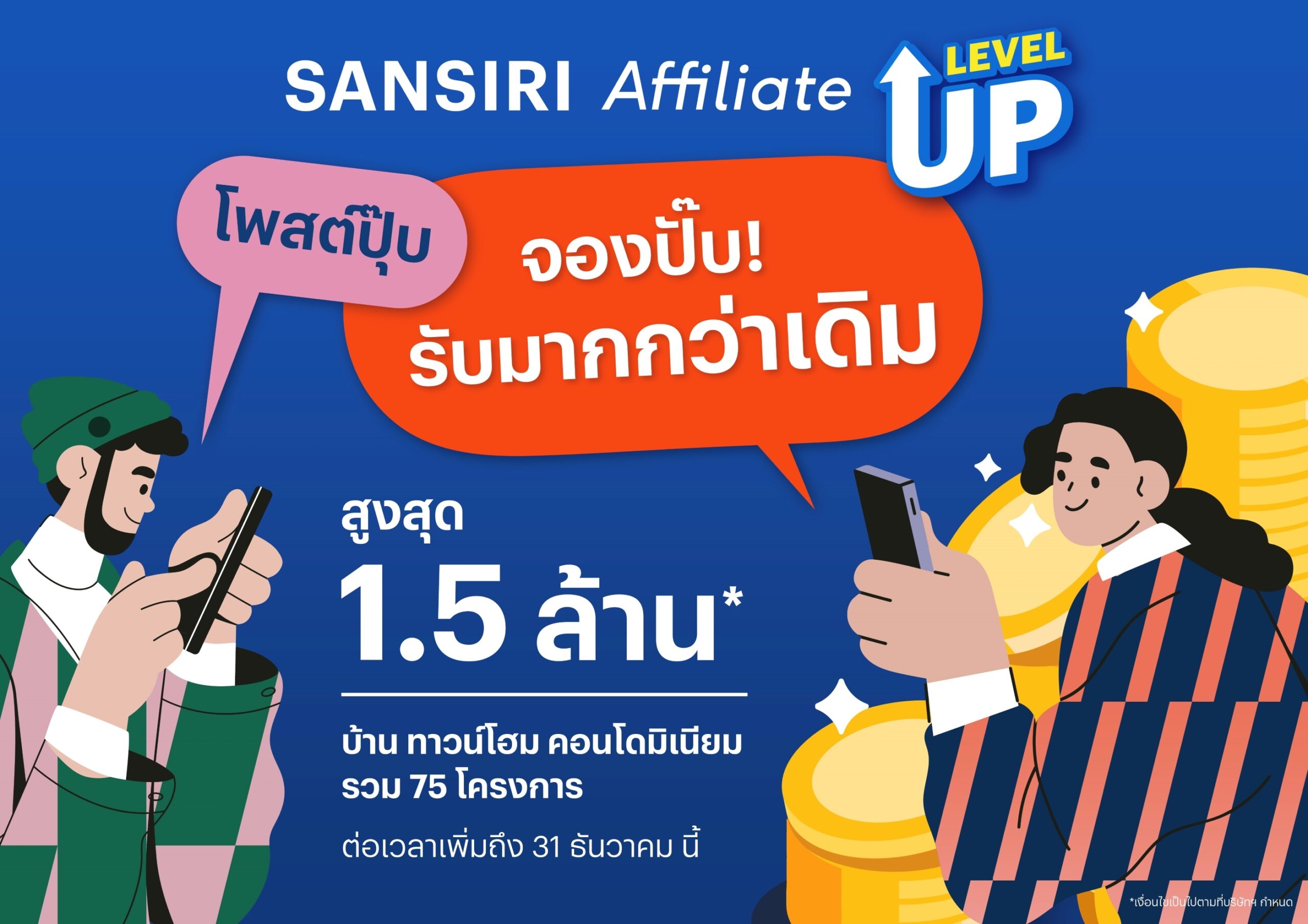 Sansiri Affiliate Level-Up ต่อเวลาเพิ่มถึง 31 ธันวาคมนี้ มอบค่าตอบแทนสูงสุดถึง 1.5 ล้านบาท* สูงสุดในอสังหาฯ และจำนวนโครงการที่เข้าร่วมโปรแกรมมากที่สุดถึง 75 โครงการ ครอบคลุมบ้าน ทาวน์โฮมและคอนโดมิเนียม ทั้งโครงการใหม่และพร้อมอยู่ ครอบคลุมทุกเซกเมนต์ ทุกระดับราคา บน Strategic Location ทั่วประเทศ เปิดโอกาสให้ครีเอเตอร์จุดประกายคอนเทนต์ได้อย่างไร้ขีดจำกัดและในทุกรูปแบบ ทุกแพลตฟอร์ม พร้อมแปะลิงก์และแชร์ผ่านโซเชียลมีเดีย เพื่อสร้างโอกาสรับค่าตอบแทนได้ง่าย จากการทำคอนเทนต์เกี่ยวกับโปรดักส์แสนสิริ ที่มาพร้อมกับความโดดเด่นด้านคุณภาพ ดีไซน์ ฟังก์ชั่นและบริการหลังการขาย ที่มุ่งดูแลครอบครัวแสนสิริตลอดช่วงการอยู่อาศัย รวมถึงแต้มต่อจากความเชื่อมั่นของกลุ่มลูกค้าในแบรนด์แสนสิริ ซึ่งเป็นแบรนด์ที่อยู่อาศัย Top-of-Mind ที่หนึ่งในใจตลอดกาล