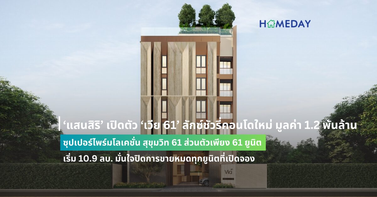 และล่าสุดคือ โครงการเวีย 61 (Via 61) ลักซ์ชัวรี่คอนโดมิเนียมใหม่จากแสนสิริ แบบ Low-Rise มูลค่าโครงการ 1,200 ล้านบาท สุดไพรเวทในซอยสุขุมวิท 61 เป็นส่วนตัวเพียง 61 ยูนิต ในรูปแบบ Pet Allowed ราคาเริ่มต้น 10.9 – 50 ล้านบาท* (ราคาเฉลี่ย 219,000 บาท/ตารางเมตร) เป็นอาคารสูง 8 ชั้น และมีชั้นใต้ดิน 1 ชั้น ด้วย Layout ห้องที่หลากหลาย เริ่มตั้งแต่ 1 ห้องนอน พื้นที่ใช้สอยเริ่มตั้งแต่ 50 ตารางเมตร ไปจนถึงเพนต์เฮาส์ขนาดสูงสุด 188.75 ตารางเมตร ที่มีเพียง 2 ยูนิตเท่านั้น โดดเด่นด้วยห้องหน้ากว้าง เปิดรับวิวทั้ง 3 ด้าน ออกแบบภายใต้แนวคิด Unveil your Living Serenity ให้ความวุ่นวายอยู่ได้แค่ภายนอก เป็น Hidden Gem ซ่อนตัวอยู่ในอ้อมกอดของความสุนทรีย์รอบด้าน เป็นแซงชัวรี่แห่งการพักอาศัยที่เงียบสงบ ดีไซน์ระดับไอคอนิก เรียบหรู แฝงไว้ด้วยความปราณีตและความหมายที่ลึกซึ้งและงดงาม เสมือนงานศิลป์ล้ำค่าหายาก (Rare Items) ครบทุกบริการหลังการขาย พร้อมมอบการดูแลลูกบ้านแบบเอ็กซ์คลูซีฟผ่านบริการ PLUS Luxury Service และ LIV-24 ศูนย์ควบคุมเพิ่มประสิทธิภาพความปลอดภัยแบบเรียลไทม์แห่งแรกของวงการอสังหาริมทรัพย์ไทย ที่สร้าง Value Added ให้กับที่อยู่อาศัยที่ถือครองอย่างต่อเนื่อง