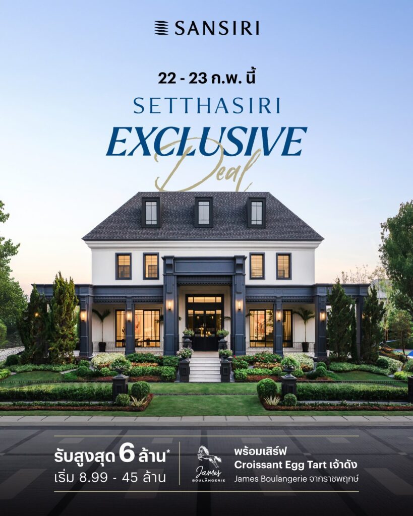 ให้คุณได้ใช้ชีวิตอย่างเพียบพร้อมที่สุดบนทำเลศักยภาพและเข้าถึงทุกความสำเร็จได้ก่อนใคร พบกับข้อเสนอในงาน “Setthasiri Exclusive Deal” รับสูงสุด 6 ล้าน* เริ่ม 8.99 – 45 ล้าน* และพิเศษกว่าที่เคย! งานนี้พร้อมเสิร์ฟครัวซองต์ทาร์ตไข่ฝรั่งเศส (Croissant Egg Tart) จาก James Boulangerie เจ้าดังจากราชพฤกษ์ ลิ้มรสความอร่อยไปพร้อมกับบรรยากาศความสวยงามของโครงการ ในวันที่ 22 – 23 กุมภาพันธ์ 2568 เท่านั้น สอบถามข้อมูลเพิ่มเติมหรือลงทะเบียนรับสิทธิพิเศษก่อนใครได้ที่ https://siri.ly/S2n2WP2 หรือโทร. 1685