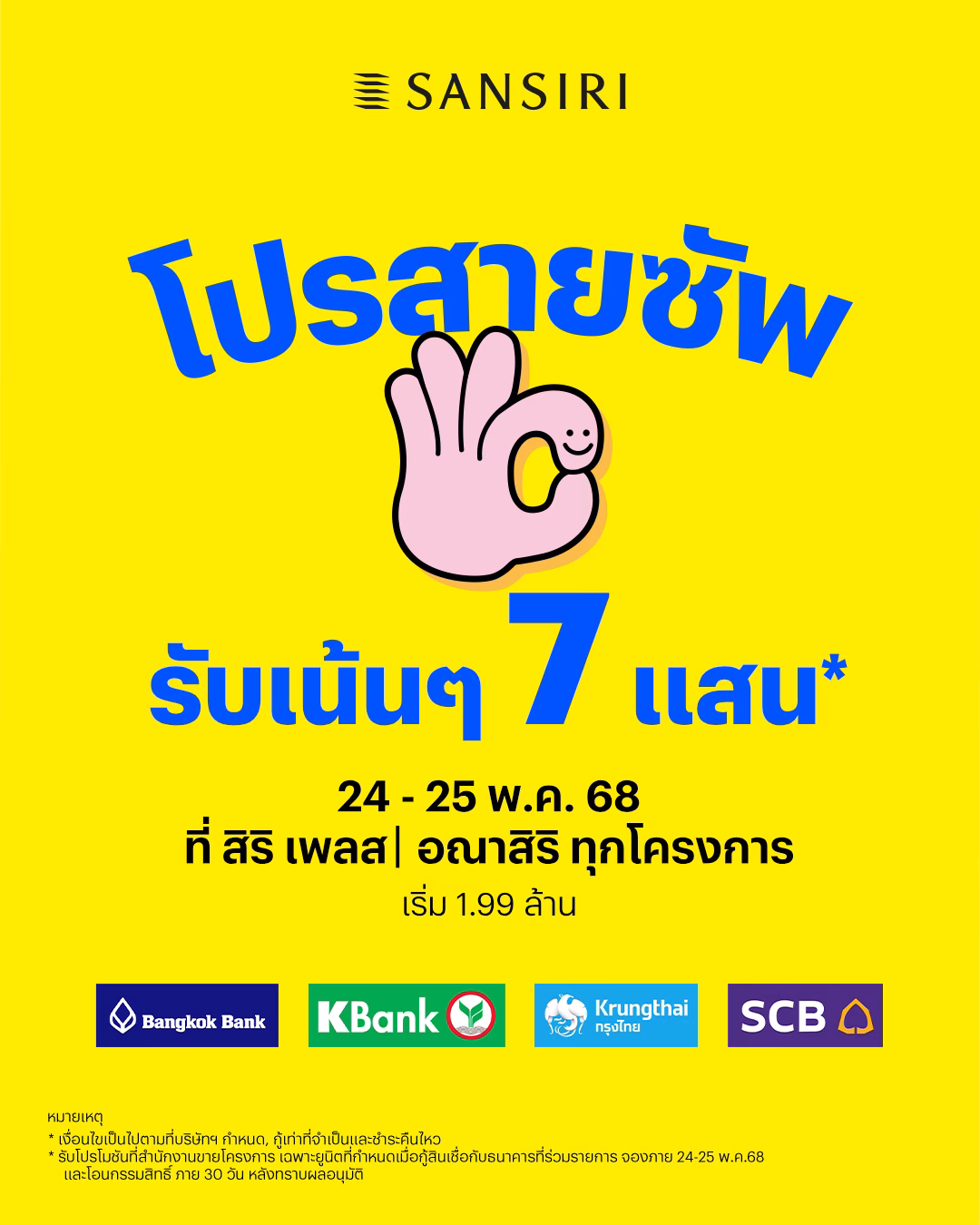 • ความร่วมมือครั้งสำคัญของอสังหาฯ รายใหญ่ และแบงก์ชั้นนำของประเทศ! แสนสิริ ผนึกพาร์ทเนอร์ 4 แบงก์ชั้นนำ: ธนาคารกรุงเทพ, ธนาคารกรุงไทย, ธนาคารกสิกรไทย และธนาคารไทยพาณิชย์ ผนึกกำลังครั้งสำคัญกับโปรโมชันที่ออกแบบมาตอบทุกโจทย์กลุ่มลูกค้า #โปรสายซัพ พร้อมซัพพอร์ตให้คุณมีบ้านง่ายกว่าเดิม รับโปร 7 ต่อ* สูงสุด 7 แสน* หรืออยู่ฟรีสูงสุด 2 ปี*