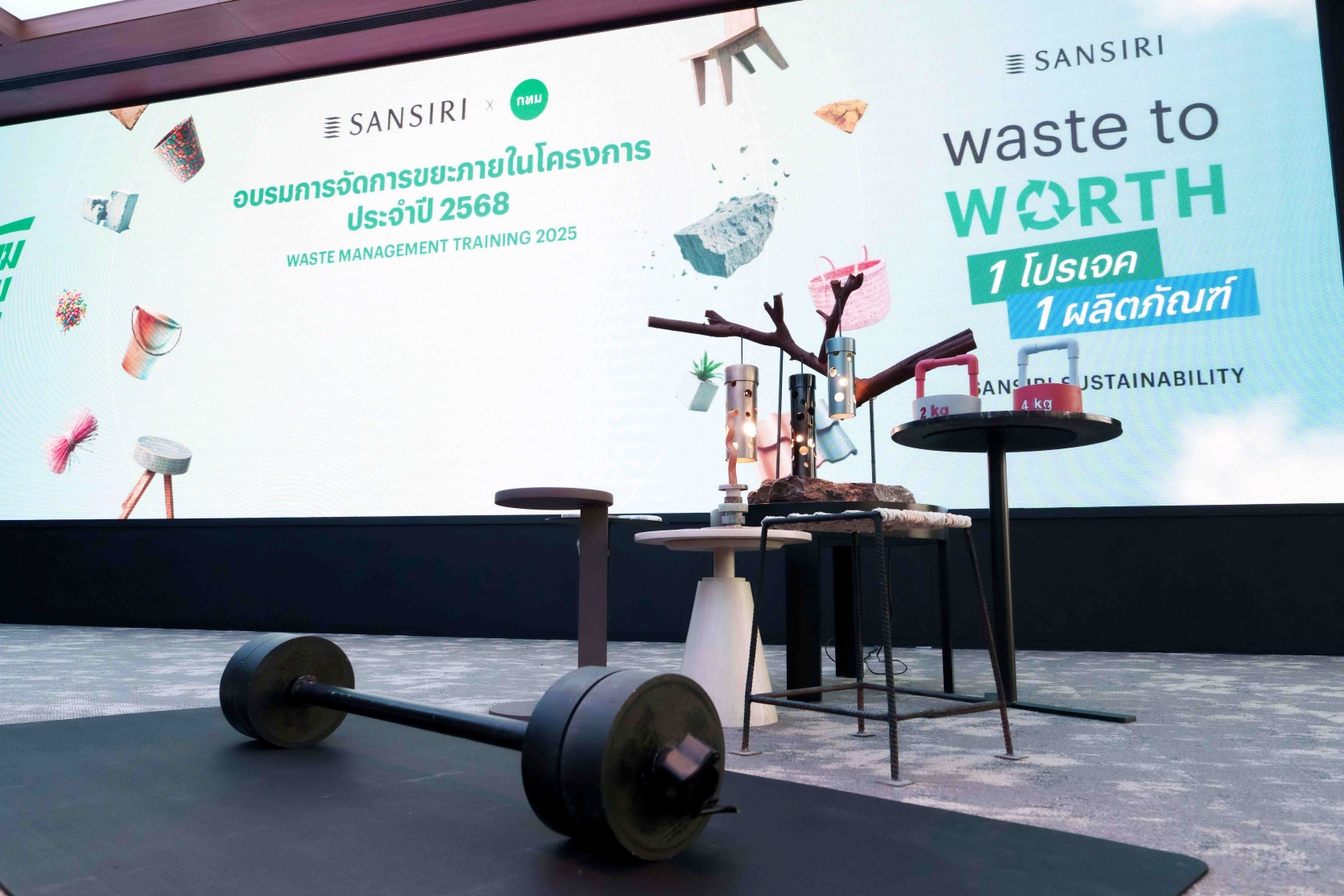 จากวิสัยทัศน์แห่งการเปลี่ยนแปลงของโครงการ #WasteToWorth แยกขยะให้เกิดประโยชน์ของแสนสิริ ล่าสุด สานต่อกับ #1โปรเจค1ผลิตภัณฑ์ แคมเปญที่จะเปลี่ยน “วัสดุเหลือใช้” ให้กลายเป็น “ของมีค่า” ด้วยพลังแห่งความคิดสร้างสรรค์ที่ไม่มีขีดจำกัด ผ่านความเชี่ยวชาญทางด้านการออกแบบของทีมสถาปนิก วิศวกร ตลอดจนคนงานก่อสร้าง โดยนำเศษวัสดุเหลือใช้จากการก่อสร้างกว่า 80 โครงการทั่วประเทศ มาสร้างสรรค์ผลิตภัณฑ์ใหม่ผ่านกระบวนการอัพไซคลิ่ง (Upcycling) อาทิ ชุดอุปกรณ์ออกกำลังกายจากเศษปูน ชุดม้านั่งสวนสาธารณะจากสายยางรัดกล่องกระเบื้อง เก้าอี้จากเศษโลหะเหลือใช้ เป็นต้น ที่ทั้งสวยงาม ใช้งานได้จริง และมีมูลค่า ซึ่งนำไปสู่ผลลัพธ์เชิงรูปธรรม ที่สร้างผลกระทบเชิงบวกต่อสิ่งแวดล้อมและสังคมอย่างชัดเจน ไม่ว่าจะเป็น ลดขยะได้ 45 ตัน คิดเป็น 71% เมื่อเปรียบเทียบกับปริมาณขยะทั้งหมดในปี 2567 เพิ่มอัตราการรีไซเคิลขยะเป็น 54% ในพื้นที่ก่อสร้าง ลดการปล่อยก๊าซเรือนกระจกได้ 5.4 ตันคาร์บอนไดออกไซด์เทียบเท่า และผลิตผลงานอัพไซคลิ่งมากกว่า 150 ชิ้น จากวัสดุเหลือใช้