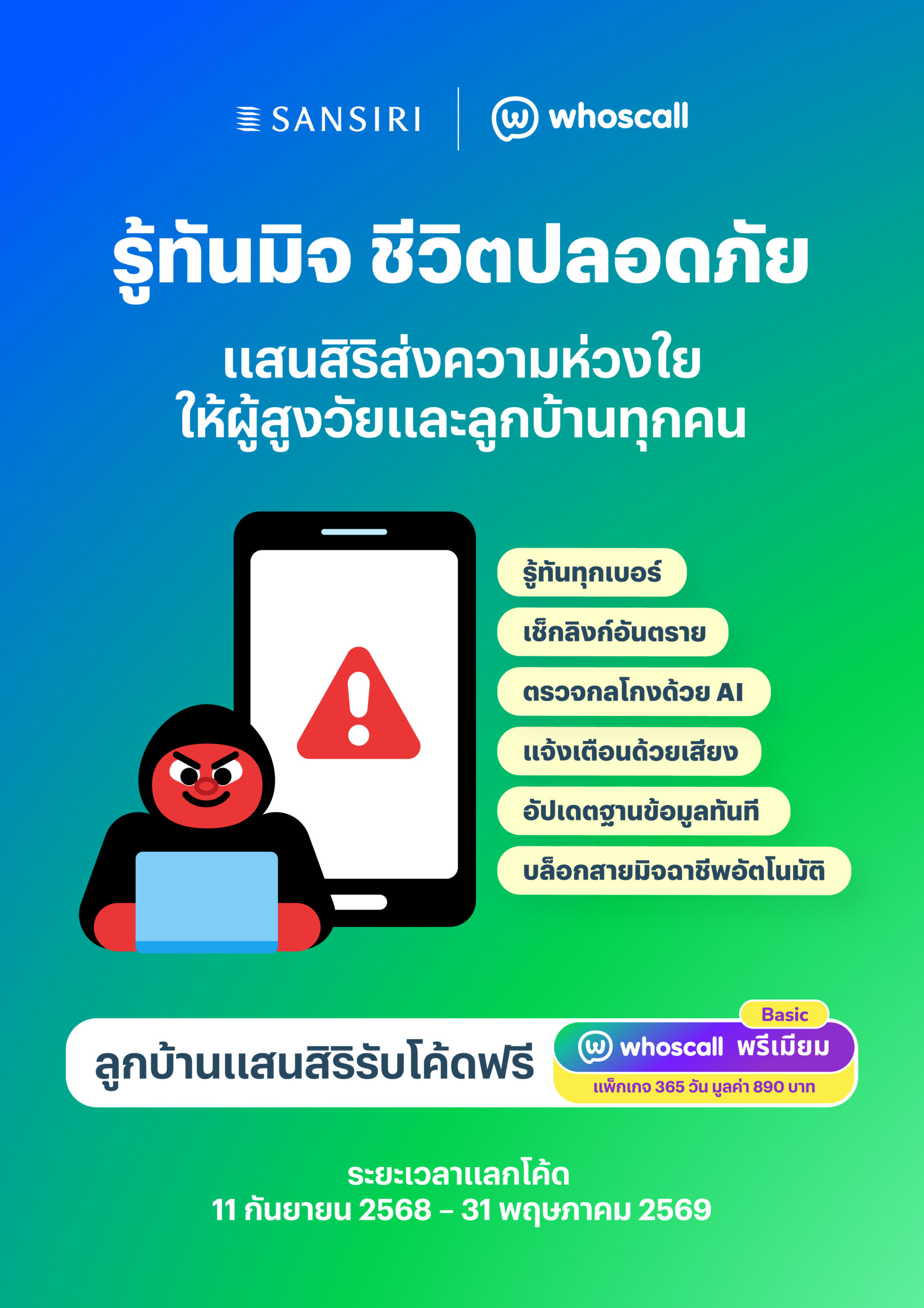 เพื่อรับมือกับความปลอดภัยรอบด้าน แสนสิริ และ Whoscall ได้ร่วมมือกัน มอบโค้ด Whoscall พรีเมียม เบสิก ฟรี 365 วัน (มูลค่า 890 บาท) ให้กับลูกบ้าน โดยลูกบ้านสามารถกดรับสิทธิ์ได้ผ่าน แอปพลิเคชัน Sansiri Home Service ตั้งแต่ 11 กันยายน 2568 ถึง 31 พฤษภาคม 2569 หรือจนกว่าโค้ดจะหมด จุดเด่นของ Whoscall พรีเมียม เบสิก คือ บล็อกสายมิจฉาชีพ และเบอร์ที่น่าสงสัยได้อัตโนมัติ,