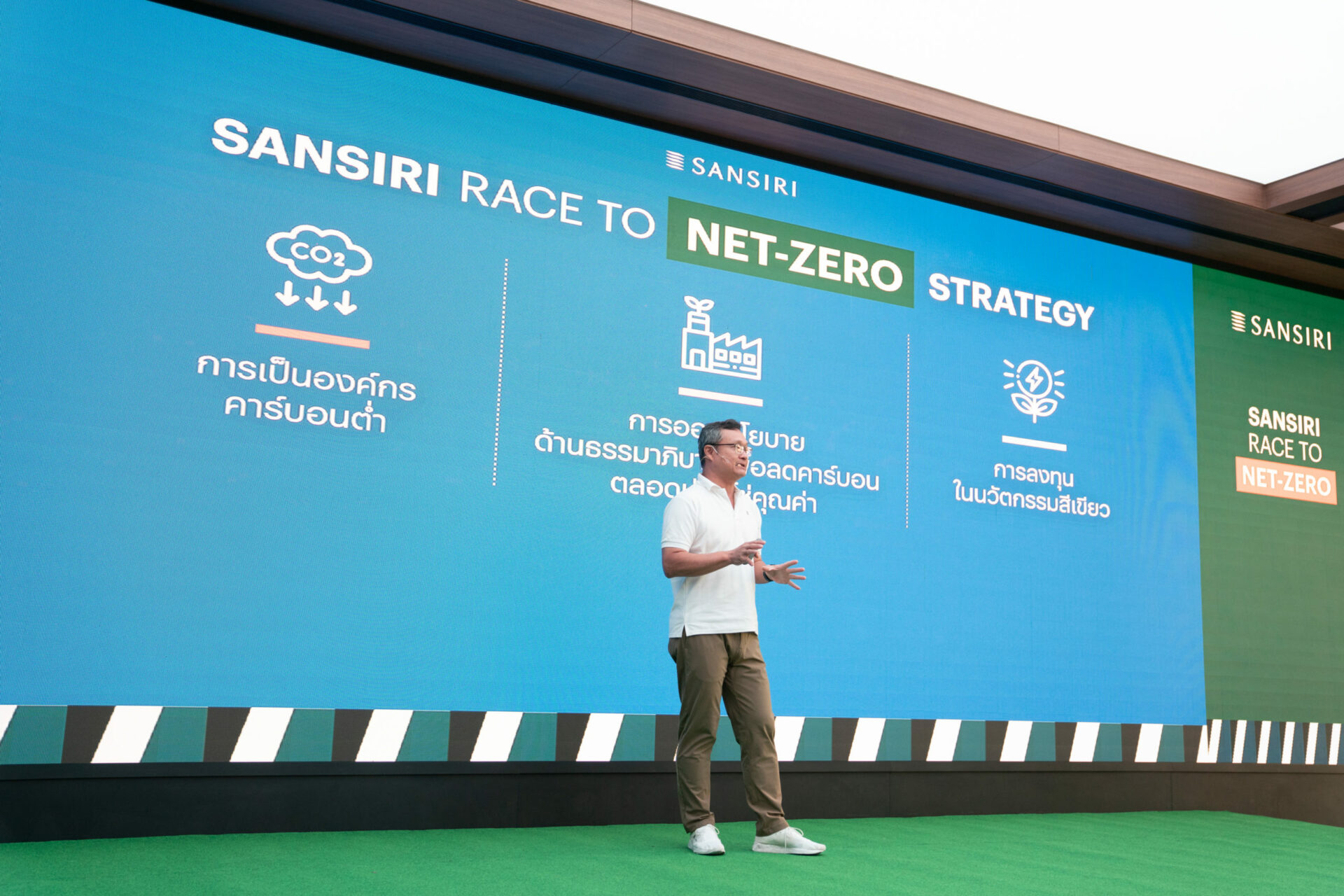 นายอุทัย กล่าวต่อว่า แสนสิริมีแผนที่จะลดการปล่อยก๊าซเรือนกระจกที่เกิดจากการดำเนินธุรกิจโดยตรงของบริษัท (ขอบเขตที่ 1 และ 2) ให้ได้ 20% ภายในปี 2025 (พ.ศ.2568) และลดก๊าซเรือนกระจกของทั้งขอบเขตที่ 1, 2 และ 3 ให้อยู่ที่ 50% ในปี 2033 (พ.ศ. 2576) โดยมีเป้าหมายสูงสุดสู่การเป็นองค์กรที่ปล่อยก๊าซเรือนกระจกเป็นศูนย์หรือ Net-Zero ให้ได้ภายในปี 2050 (พ.ศ.2593) ผ่าน 3 กลยุทธ์ ได้แก่ 1.ก้าวสู่การเป็นองค์กรคาร์บอนต่ำ มุ่งประหยัดพลังงานและใช้พลังงานอย่างมีประสิทธิภาพ ยกระดับการการใช้นวัตกรรมเพื่อพลังงานสะอาดเป็น 100% ภายในปี 2025 (พ.ศ.2568) ผ่านการขยายแผนการติดตั้ง Solar Roof และ EV Charger ครบ 100% ให้กับบ้านแสนสิริทุกหลังทุกระดับราคา 2.ออกนโยบายด้านธรรมาภิบาลเพื่อลดคาร์บอนตลอดห่วงโซ่คุณค่า ภายใต้การดำเนินการ 3G และ 3.การลงทุนในนวัตกรรมสีเขียว ลงทุนในบริษัทที่เป็นมิตรกับสิ่งแวดล้อมที่เกี่ยวข้องกับเทคโนโลยีพลังงานสะอาด และเทคโนโลยีการก่อสร้างที่เป็นมิตรกับสิ่งแวดล้อม ด้วยงบประมาณ 500 ล้านบาท ซึ่งปัจจุบันได้ลงทุนไปแล้ว 3 บริษัท คิดเป็นเงินลงทุนประมาณ 120 ล้านบาท