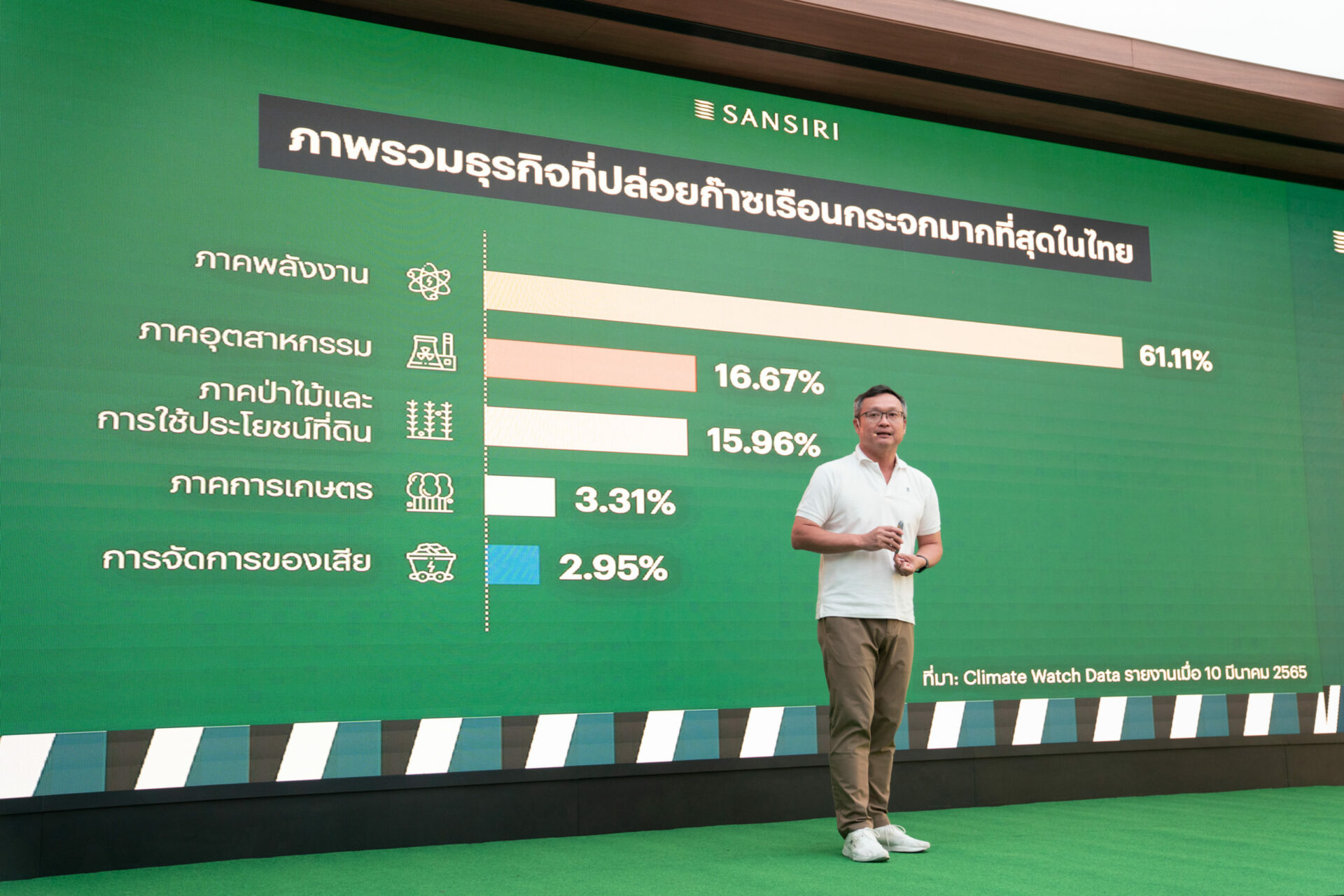 นายอุทัย อุทัยแสงสุข ประธานผู้บริหารสายงานปฏิบัติการ บริษัท แสนสิริ จำกัด (มหาชน) หรือ SIRI เปิดเผยว่า หลังจากประกาศความมุ่งมั่นในการเป็นบริษัทอสังหาริมทรัพย์รายแรกของไทยที่ตั้งเป้าหมายการปล่อยก๊าซเรือนกระจกสุทธิเป็นศูนย์ (Net-zero) แสนสิริได้เดินหน้าสู่เป้าหมายในทุกรูปแบบเพื่อร่วมแก้ปัญหาเรื่องการเปลี่ยนแปลงสภาพภูมิอากาศ (Climate Change) ซึ่งเป็นเรื่องใกล้ตัวเรามากขึ้นทุกขณะ โดยจากข้อมูลของ Climate Watch Data พบว่าภาพรวมภาคธุรกิจในประเทศไทยที่ปล่อยก๊าซเรือนกระจกมากที่สุด คือ ภาคพลังงาน ซึ่งมีสัดส่วนมากที่สุดถึง 61.11% รองลงมาคือ ภาคอุตสาหกรรม 16.67% ตามด้วย ภาคการเกษตร 15.96% และ ภาคป่าไม้และการใช้ประโยชน์ที่ดิน 3.31%