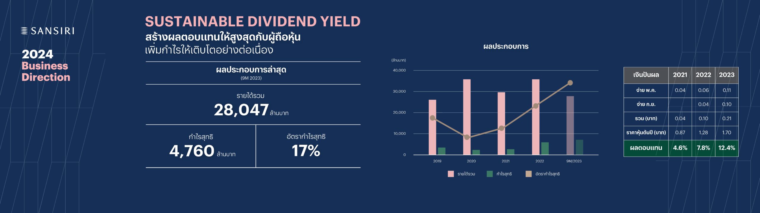 นอกจากนี้ แสนสิริยังมุ่งสร้างผลตอบแทนสูงสุดกับผู้ถือหุ้น จากผลกำไรที่เติบโตต่อเนื่อง เพื่อให้นักลงทุนได้รับเงินปันผลที่สูงขึ้นในอนาคต จากสถิติการจ่ายปันผลที่มาพบว่า Dividend Yield ปี ล่าสุด 2566 อยู่ที่ 12.4%
