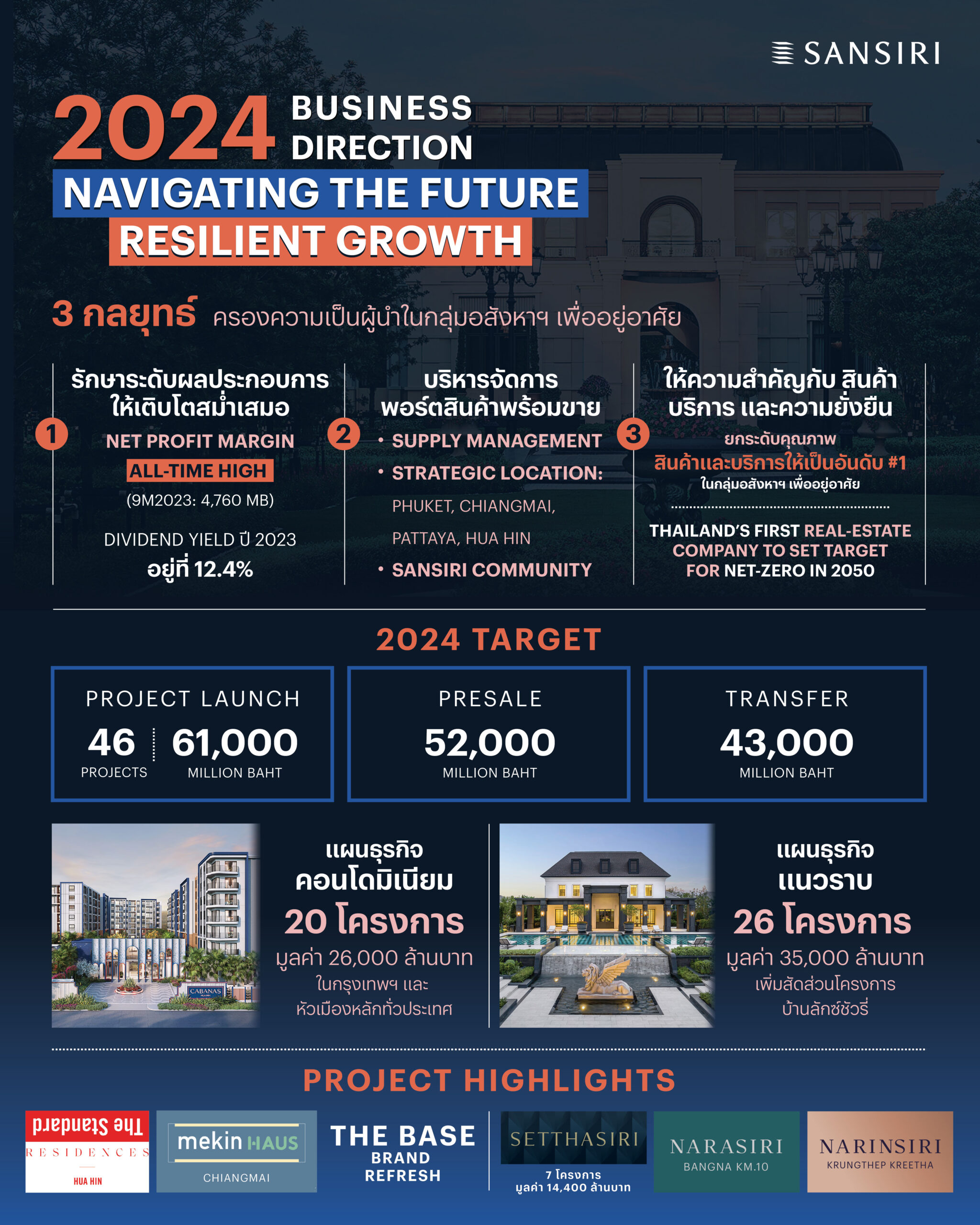 “สำหรับปี 2567 นี้ แสนสิริ รุดหน้าขยายธุรกิจเพื่อการเติบโตอย่างยั่งยืน วางแผนเปิดตัวรวม 46 โครงการ มูลค่ารวม 61,000 ล้านบาท บนทำเลศักยภาพในกรุงเทพฯ และตลาดต่างจังหวัด โดยเพิ่มสัดส่วนของโครงการบ้านลักซ์ชัวรี่มากขึ้น และตั้งเป้ายอดขาย 52,000 ล้านบาท และยอดโอนที่ 43,000 ล้านบาท เริ่มจากกลุ่มธุรกิจแนวราบ วางแผนเปิดตัวรวม 26 โครงการ มูลค่ารวม 35,000 ล้านบาท โครงการที่เป็นไฮไลท์ในปีนี้ ประเดิมด้วยกลุ่ม Sansiri Luxury Collection 2 โครงการ ได้แก่ บ้านเดี่ยวระดับซูเปอร์ลักซ์ชัวรี่ ‘นาราสิริ บางนา กม. 10’ มูลค่าโครงการ 3,800 ล้านบาท ราคา 45 – 70 ล้านบาท รวมถึงต่อยอดความสำเร็จของแบรนด์บ้านเดี่ยวระดับลักซ์ชัวรี่ กับการเปิดตัวเศรษฐสิริรวม 7 โครงการ มูลค่ารวม 14,400 ล้านบาท นำร่องด้วยเศรษฐสิริ วัชรพล – เทพรักษ์โครงการใหม่ สไตล์ Georgian ใกล้ทางด่วน ใจกลางวัชรพล มูลค่า 2,700 ล้านบาท ตอกย้ำความเป็นผู้นำตลาดอสังหาฯ ระดับซูเปอร์ลักซ์ชัวรี่และลักซ์ชัวรี่ไทยตัวจริง พร้อมเดินหน้ารุกตลาดแนวราบในระดับราคาเข้าถึงง่าย ผ่านการเปิดตัวสราญสิริรวม 6 โครงการ มูลค่ารวม 9,100 ล้านบาท กับจุดขายบ้านเดี่ยวหลังแรกของครอบครัว และอณาสิริรวม 4 โครงการ มูลค่ารวม 4,100 ล้านบาท เพื่อส่งมอบโปรดักส์อย่างครอบคลุมทั้งบ้านเดี่ยว บ้านแฝดและทาวน์โฮม พร้อมกันนี้ แสนสิริจ่อคิวขยายพอร์ตแนวราบ เตรียมเปิดตัว 2 แบรนด์ใหม่ ได้แก่ ‘ณริณสิริ’ (Narinsiri) แบรนด์บ้านเดี่ยวใหม่ระดับพรีเมียมโครงการแรก ‘ณริณสิริ กรุงเทพกรีฑา’ มูลค่าโครงการ 1,800 ล้านบาท และ ‘มาเบิล’ (Mabel) แบรนด์บ้านเดี่ยวใหม่ระดับราคาเข้าถึงง่ายประมาณ 5-7 ล้านบาท กับ ‘มาเบิล บางนา 26’ มูลค่าโครงการ 850 ล้านบาท สำหรับกลุ่มธุรกิจแนวสูง แสนสิริเคาะแผนเปิดตัวคอนโดมิเนียม 20 โครงการ มูลค่ารวม 26,000 ล้านบาท พร้อมสานต่อกลยุทธ์ความสำเร็จในปีที่ผ่านมา รุกแผนขยายการเปิดตัวโครงการใหม่ เน้นขยายการลงทุนไปยังหัวเมืองท่องเที่ยวมากขึ้น โดยมีไฮไลท์ดังนี้ เริ่มจากกลุ่มคอนโดมิเนียมระดับลักซ์ชัวรี่ขึ้นไป ได้แก่ การเปิดขาย ‘เดอะ สแตนดาร์ด เรสซิเด้นซ์ หัวหิน’ มูลค่าโครงการ 4,100 ล้านบาท Branded Residence แห่งแรกในเอเชียและแห่งที่ 3 ของโลก ภายใต้เดอะ สแตนดาร์ด แบรนด์บูทีคโฮเทลและไลฟ์สไตล์ชั้นนำระดับโลก และการเปิดตัวเวีย 2 โครงการใหม่ มูลค่ารวม 2,500 ล้านบาท บนสุดยอดทำเลศักยภาพที่มีดีมานด์ แต่ซัพพลายน้อย ในย่านสุขุมวิท 34 และ 61 ตลอดจนการลุยต่อตลาดคอนโดมิเนียมราคาเข้าถึงง่าย อย่างแบรนด์แคมปัสคอนโด กับการเปิดตัวดีคอนโดรวม 3 โครงการ มูลค่ารวม 2,800 ล้านบาท และการพัฒนาโครงการคอนโดในกลุ่มแบรนด์เดอะ มูฟและคอ