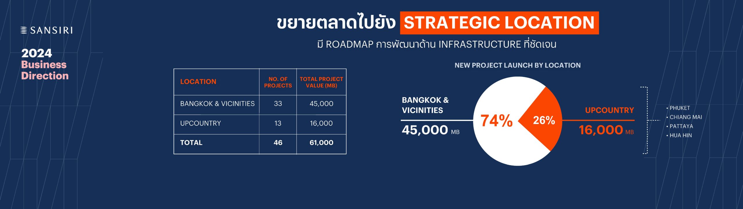 ภายใต้กลยุทธ์นี้ แสนสิริ พร้อมขยายโอกาสในการลงทุนกับพันธมิตรทางธุรกิจรายใหม่ๆ เพื่อพัฒนาโครงการร่วมกัน ตลอดจนกลับไปรุก Strategic Location หัวเมืองใหญ่และเมืองท่องเที่ยวที่มีศักยภาพ มีโรดแมปการพัฒนาด้านโครงสร้างพื้นฐานที่ชัดเจน และได้รับอานิสงส์จากการฟื้นตัวของการท่องเที่ยวและเป็นที่นิยมของชาวต่างชาติ ได้แก่ ภูเก็ต เชียงใหม่ พัทยา หัวหิน โดยวางแผนจะเปิดตัวโครงการในต่างจังหวัดทั้งหมด 13 โครงการ มูลค่ารวม 16,000 ล้านบาท โตกว่าปีก่อนหน้าถึง 170% สำหรับ Strategic Location อย่างภูเก็ต ได้มีการจัดทำแผนกลยุทธ์ 5 ปี ในการเปิดตัวโครงการใหม่ 16 โครงการ มูลค่ารวม 15,000 ล้านบาท รวมถึงวางแผนเปิดตัว Sansiri Hub หรือออฟฟิศของแสนสิริในจังหวัดภูเก็ตในปี 2567 นี้ด้วยเช่นกัน รวมถึงหัวหินกับโครงการเดอะ สแตนดาร์ด เรสซิเด้นซ์ หัวหิน ที่จะเปิดตัวในเดือนกุมภาพันธ์นี้