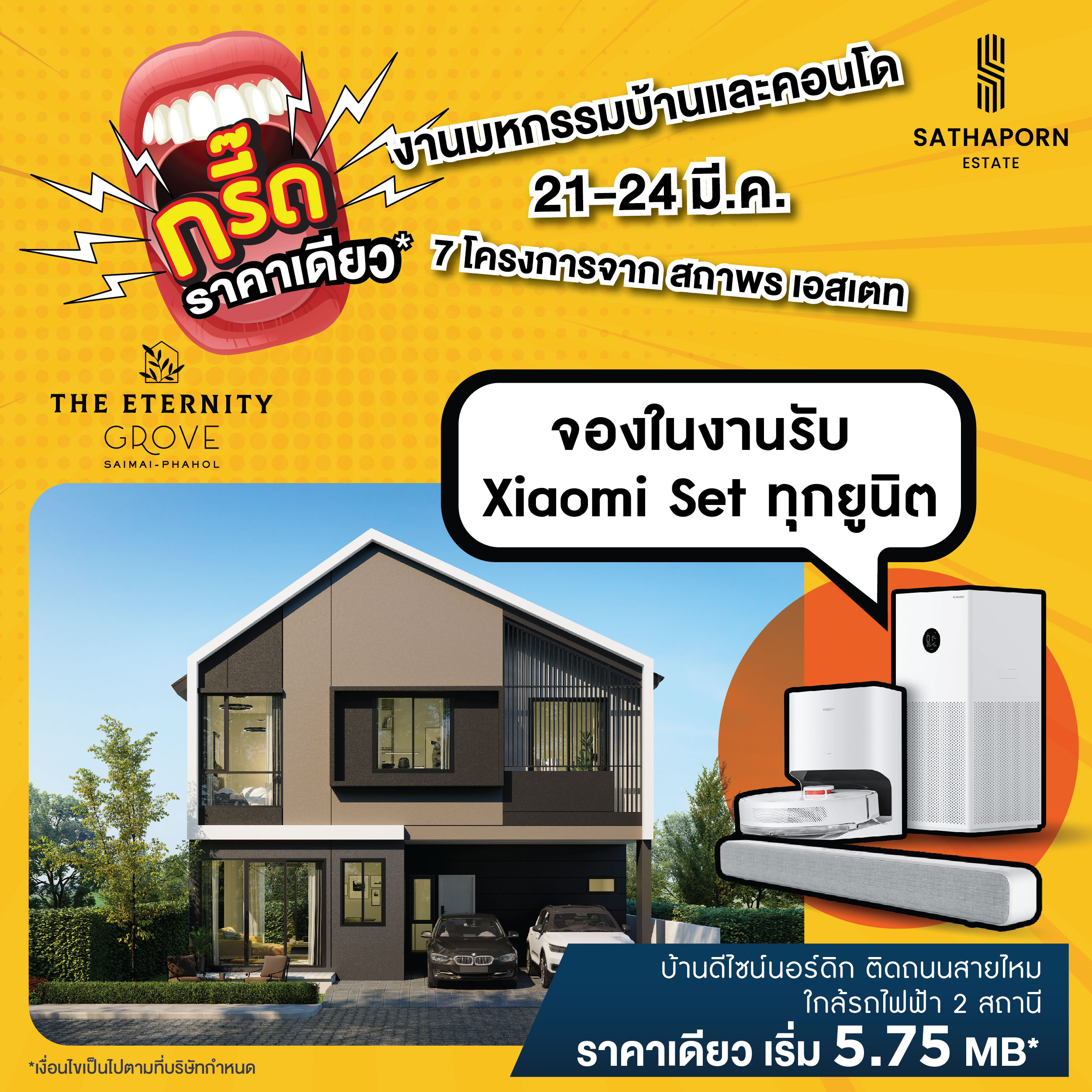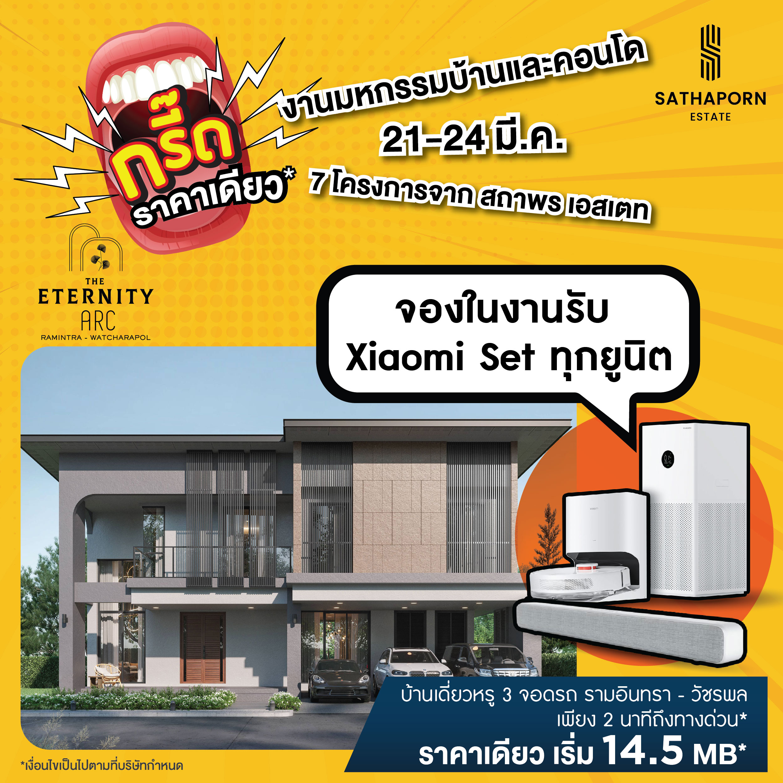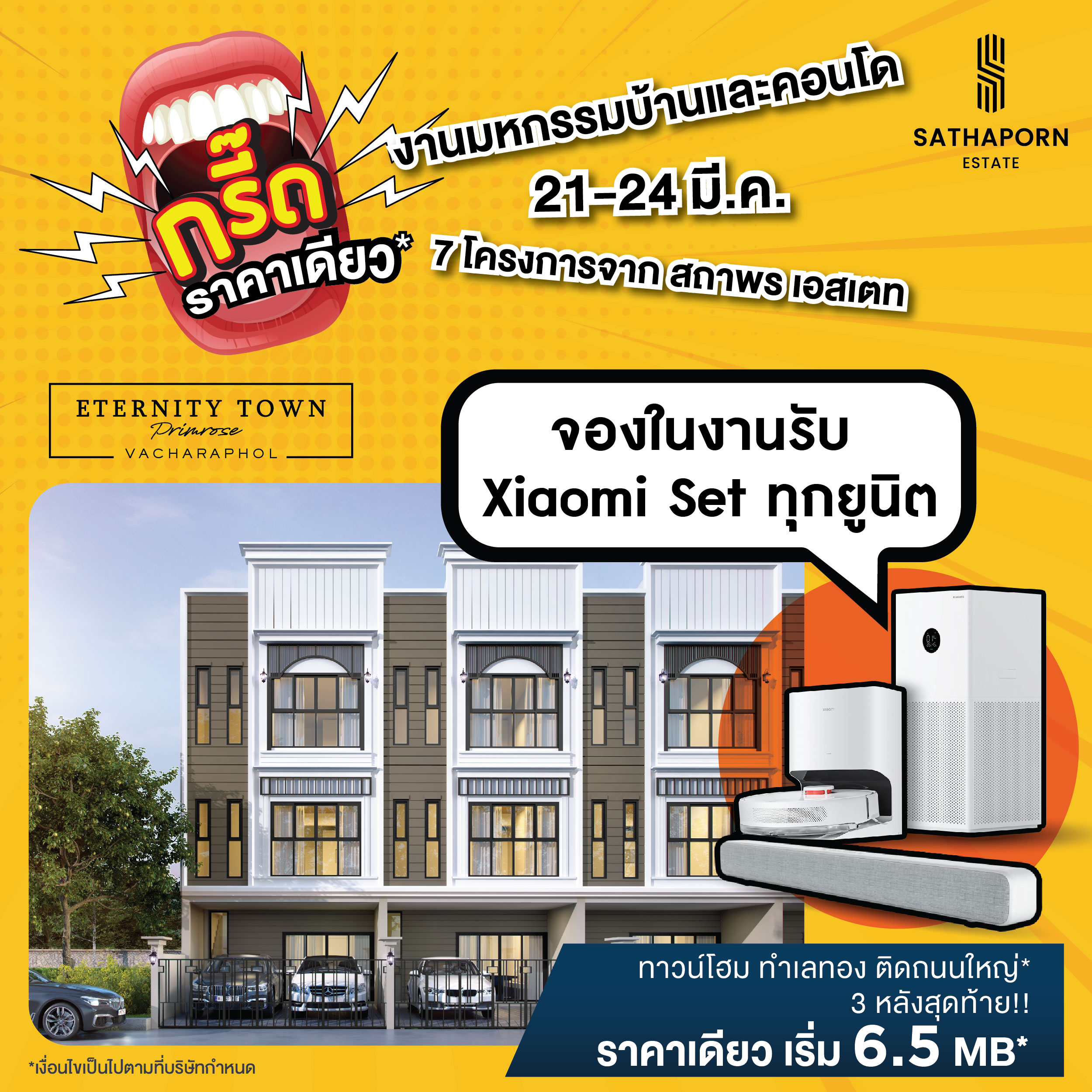 สถาพร เอสเตท ขนทัพบ้านเดี่ยว ทาวน์โฮม และคอนโดมิเนียม ทั้ง 7 โครงการคุณภาพ ที่คัดสรรมาให้พิเศษ ทั้งโครงการพร้อมอยู่และโครงการใหม่ ร่วมออกบูธภายในงาน “มหกรรมบ้านและคอนโด ครั้งที่ 45” พร้อมจัดโปรใหญ่จนต้องร้องกรี๊ด!!! ลดแรงแบบไม่กั๊ก ราคาเดียว และรับเพิ่ม Xiaomi Set ทุกยูนิต เพียงจองภายในงาน พบกันได้ที่บูธ 4 – 8 และ 53 – 57 ณ ฮอลล์ 5 ชั้น LG ศูนย์การประชุมแห่งชาติสิริกิติ์ วันที่ 21 – 24 มีนาคมนี้ เท่านั้น