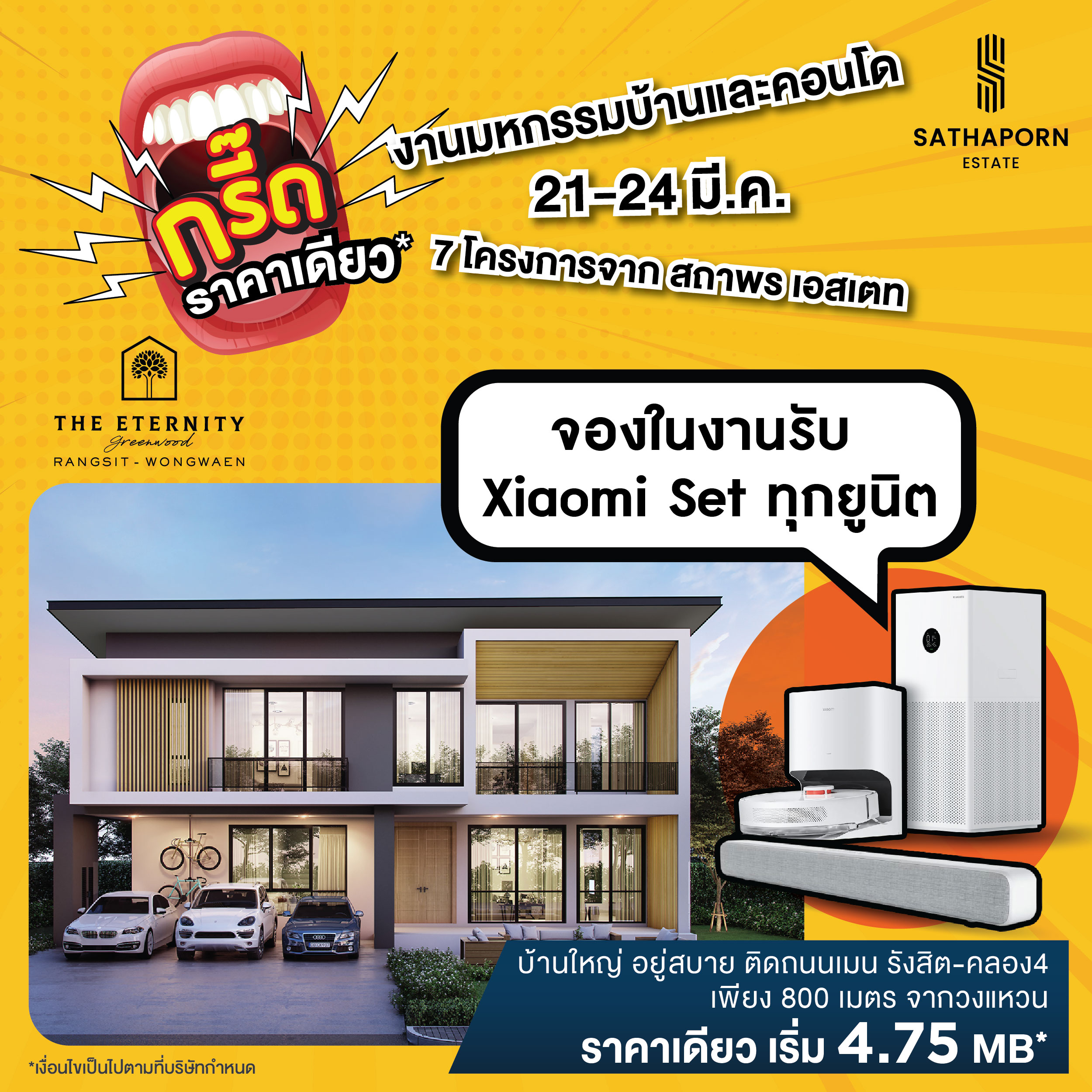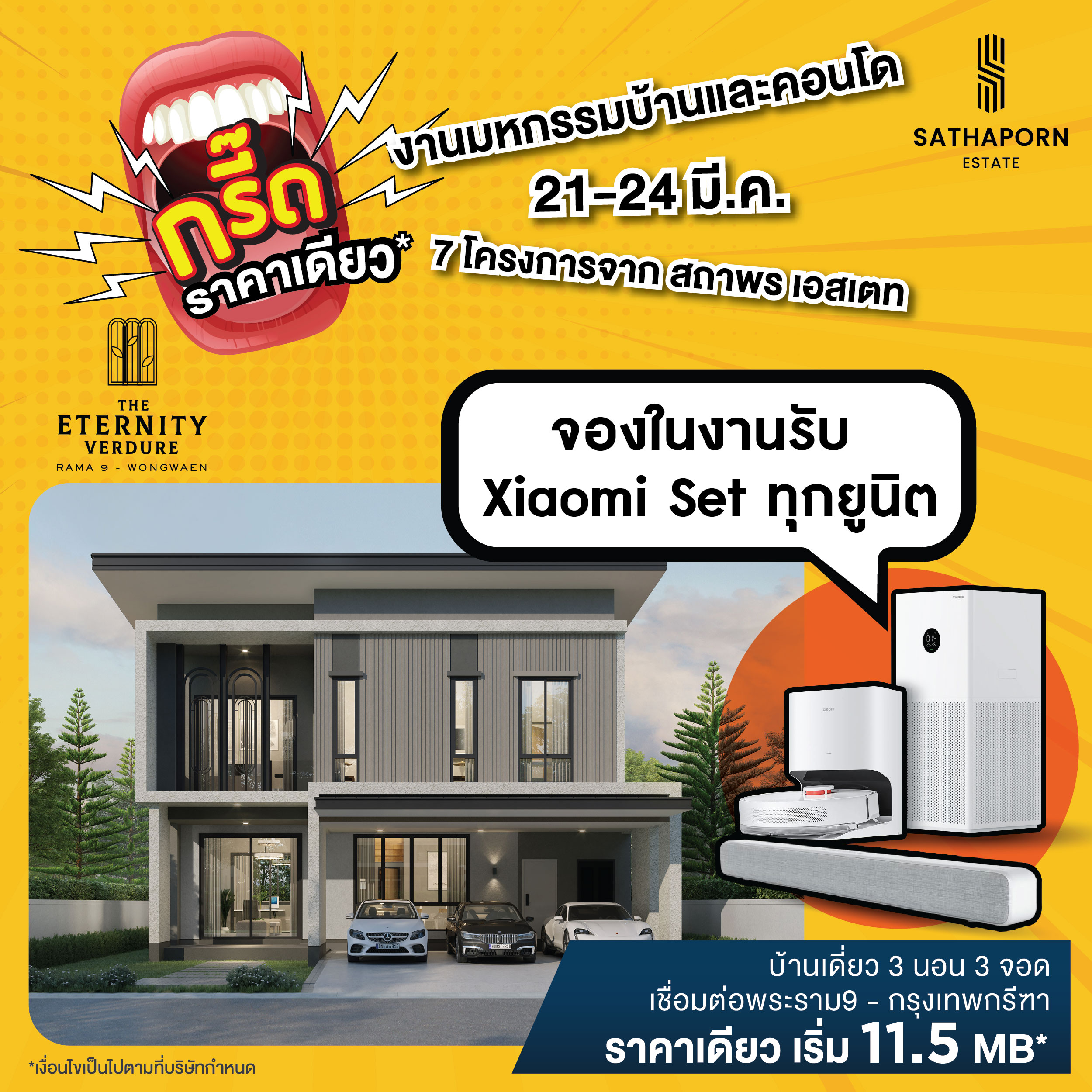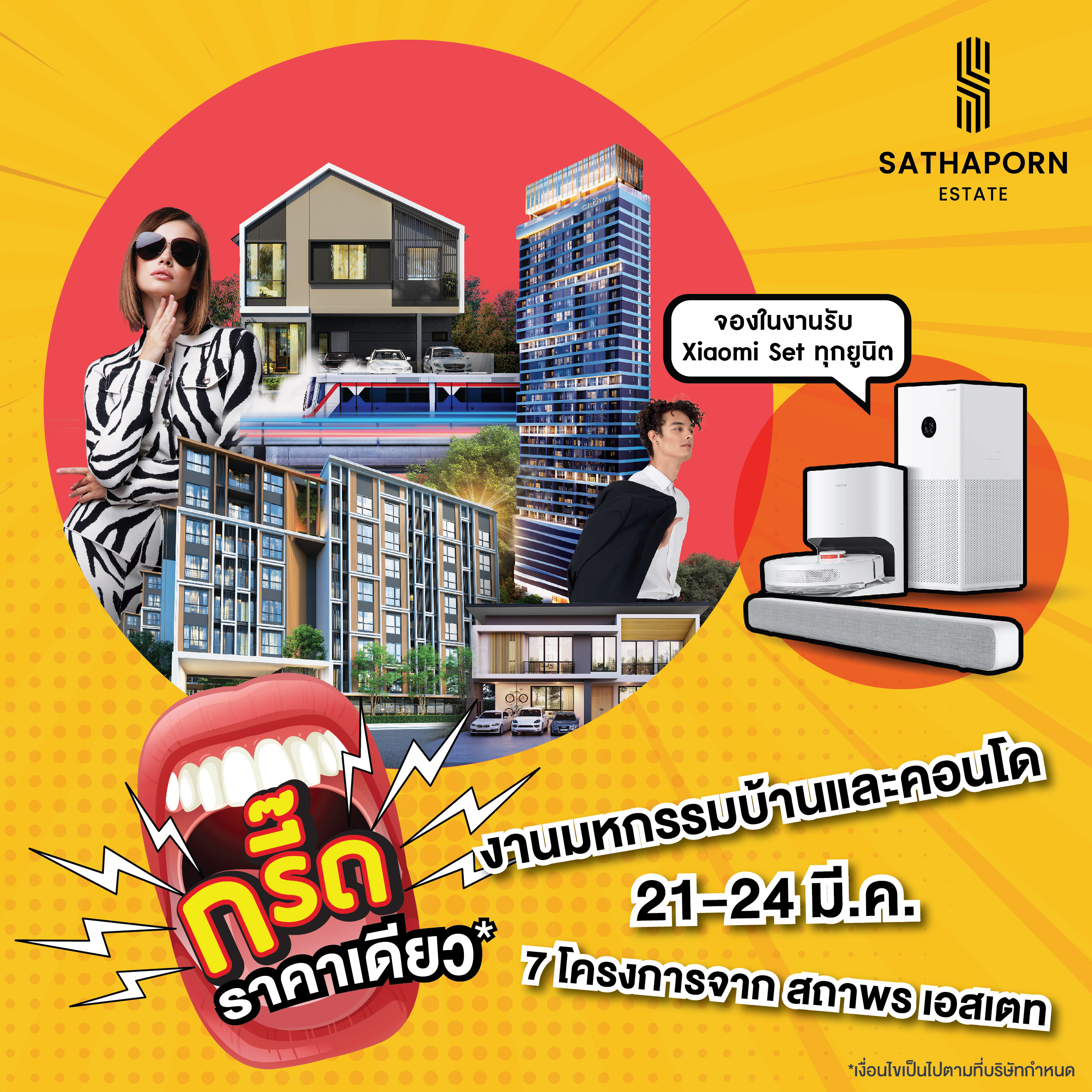 สถาพร เอสเตท ขนทัพบ้านเดี่ยว ทาวน์โฮม และคอนโดมิเนียม ทั้ง 7 โครงการคุณภาพ ที่คัดสรรมาให้พิเศษ ทั้งโครงการพร้อมอยู่และโครงการใหม่ ร่วมออกบูธภายในงาน “มหกรรมบ้านและคอนโด ครั้งที่ 45” พร้อมจัดโปรใหญ่จนต้องร้องกรี๊ด!!! ลดแรงแบบไม่กั๊ก ราคาเดียว และรับเพิ่ม Xiaomi Set ทุกยูนิต เพียงจองภายในงาน พบกันได้ที่บูธ 4 – 8 และ 53 – 57 ณ ฮอลล์ 5 ชั้น LG ศูนย์การประชุมแห่งชาติสิริกิติ์ วันที่ 21 – 24 มีนาคมนี้ เท่านั้น