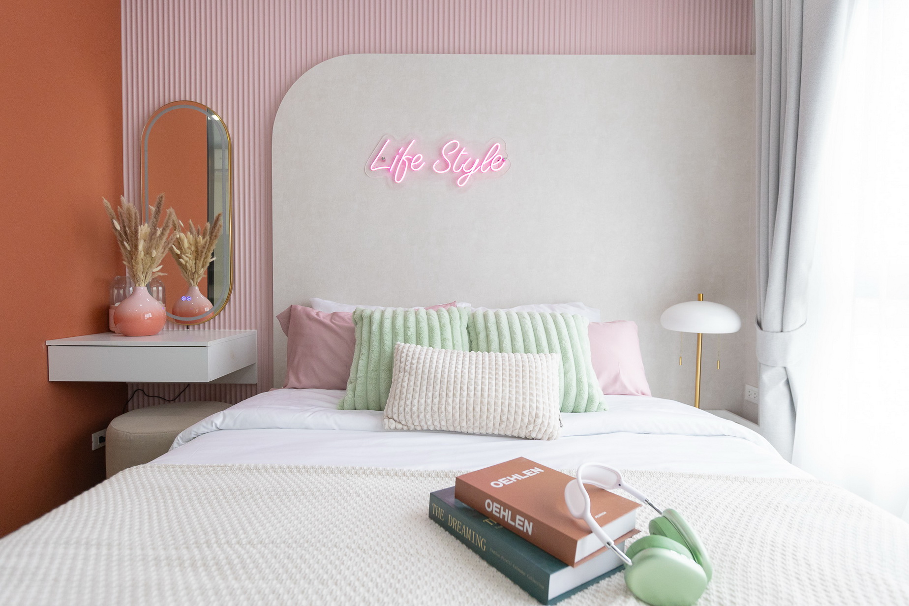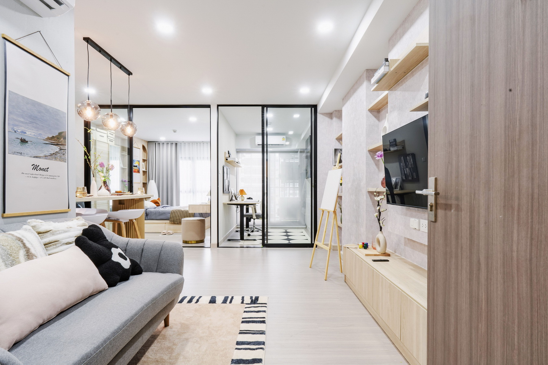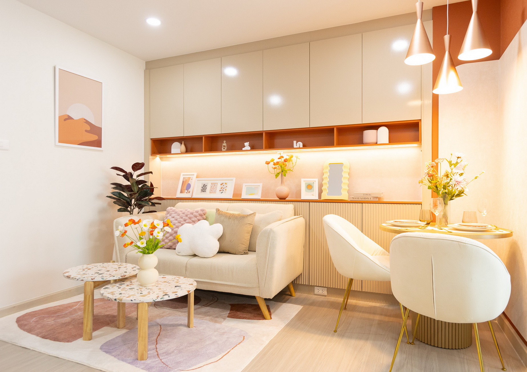 การตกแต่งห้องชุดแบบแรก แบบ 1 ห้องนอน ขนาด 34.44 ตร.ม. ชูจุดเด่นสไตล์ Minimal Korean มาพร้อมการสื่อสารถึงวัฒนธรรมเกาหลี ด้วยความเรียบง่าย สไตล์โมเดิร์น โทนสีสว่าง สดใส และเพิ่มสีสันโทนพาสเทล ทำให้ผู้อยู่อาศัยรู้สึกผ่อนคลาย ส่วนการตกแต่งห้องชุดแบบที่ 2 แบบ 1 ห้องนอน 1 ห้องอเนกประสงค์ ขนาด 44.43 ตร.ม. เน้นสไตล์ Charming Japandi บ่งบอกถึงความเป็นสุนทรียศาสตร์ของญี่ปุ่น ผสมผสานความเป็นธรรมชาติ ใช้โทนสีเบจ สีอ่อน และสีไม้ธรรมชาติเป็นหลัก ทำให้ผู้อยู่อาศัยรู้สึกเหมือนอยู่ท่ามกลางธรรมชาติ