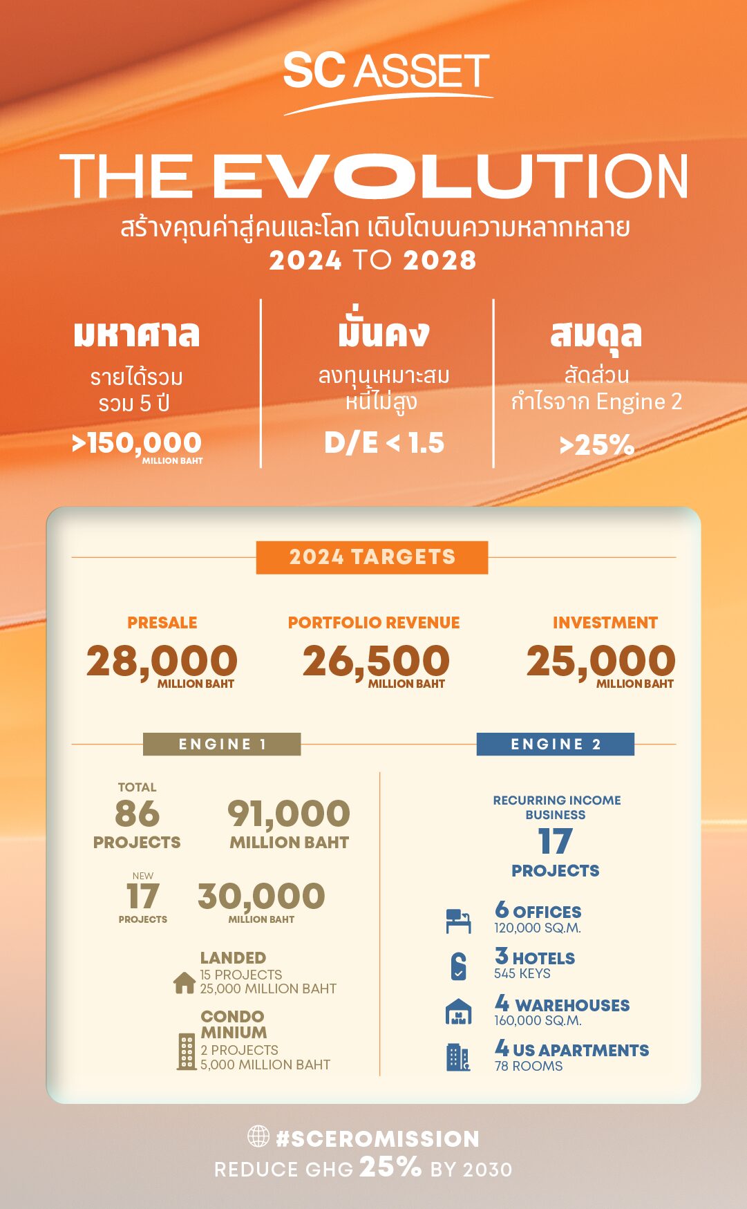SC ก้าวสู่ทศวรรษที่ 3 ประกาศวิสัยทัศน์ธุรกิจ “SC the Evolution “สร้างคุณค่าสู่คนและโลก เติบโตบนความหลากหลาย” มั่นใจกวาดรายได้รวม รวม 5 ปี 150,000 ลบ. ปี 2567 ตั้งเป้ายอดขายนิวไฮ 28,000 ลบ. และ ทุ่มงบลงทุนกว่า 25,000 ลบ. พร้อมลุยธุรกิจหลากหลาย ที่อยู่อาศัย โรงแรม คลังสินค้า ออฟฟิศ