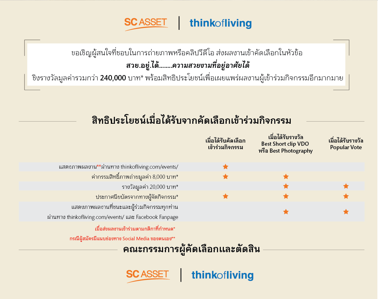 Think of Living เว็บไซต์รีวิวโครงการอสังหาริมทรัพย์ชั้นนำของประเทศ ร่วมกับ บริษัท เอสซี แอสเสท คอร์ปอเรชั่น จำกัด (มหาชน) หรือ SC ผู้นำอสังหาริมทรัพย์คุณภาพสูง และ มีนวัตกรรม เปิดตัวโครงการประกวดถ่ายภาพ “A Place Called Home ครั้งที่ 3” ในหัวข้อ “สวย อยู่ ได้” เชิญชวนผู้ที่มีใจรักในการถ่ายภาพร่วมถ่ายทอดมุมมองความสวยงามของการออกแบบและตกแต่งบ้านที่ผสมผสานอยู่ในทุกการอยู่อาศัย เพียงส่งผลงานภาพถ่ายหรือคลิปวิดีโอเพื่อคัดเลือกร่วมเป็นส่วนหนึ่งในกิจกรรมประกวดภาพถ่าย โดยผู้ผ่านการคัดเลือกเพียง 20 ท่านจะได้สิทธิ์ในการร่วมถ่ายภาพสุด Exclusive กับ 4 โครงการใหม่ของ SC ASSET พร้อมลุ้นเงินรางวัลรวมมูลค่ากว่า 240,000 บาท ผู้สนใจสามารถส่งผลงานภาพถ่ายและคลิปวิดีโอได้ตั้งแต่วันนี้-10 เมษายนนี้ ผ่านทาง https://thinkofliving.com/events