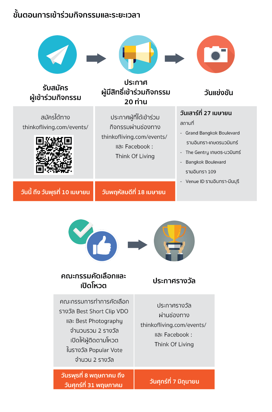 ของรางวัล คณะกรรมการจะทำการคัดเลือกรางวัล BEST PHOTOGRAPHY และ BEST SHORT CLIP VDO และเปิดให้ประชาชนทั่วไปร่วมโหวตรางวัล Popular vote (Photo) และ Popular vote (Short Clip VDO) โดยประกาศผลรางวัลผ่านทาง https://thinkofliving.com/events สำหรับของรางวัลมีรายละเอียดดังนี้