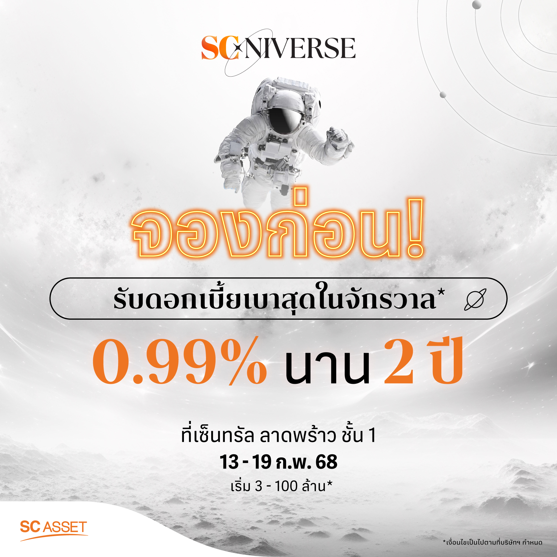 บริษัท เอสซี แอสเสท คอร์ปอเรชั่น จำกัด (มหาชน) ผู้นำอสังหาริมทรัพย์คุณภาพสูงและมีนวัตกรรม เปิดประสบการณ์ค้นหาจักรวาลที่ใช่ไปกับงาน ‘SCniverse’ พร้อมคัดสรรโครงการบนทำเลศักยภาพระดับพรีเมี่ยมกว่า 72 โครงการ ในราคาเริ่มต้น 3 – 100 ล้านบาท* มาให้เลือกกันแบบจุใจ จัดเต็มกับข้อเสนอสุดพิเศษและกิจกรรมมากมาย ตั้งแต่วันนี้ถึง 19 กุมภาพันธ์ 2568 ณ เซ็นทรัลลาดพร้าว โซน C ชั้น 1 ตั้งแต่เวลา 10.00 – 21.00 น.