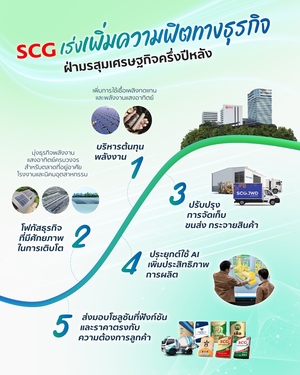 แม้เอสซีจีได้รับผลกระทบจากวัฏจักรปิโตรเคมีโลกยังอยู่ในช่วงขาลง ความตึงเครียดจากความขัดแย้งทางภูมิรัฐศาสตร์ ตลาดแข่งขันสูงจากสินค้านำเข้าจากจีน เศรษฐกิจในประเทศฟื้นตัวช้าจากกำลังซื้อที่อ่อนแอในกลุ่มผู้มีรายได้ปานกลาง-น้อย เอสซีจีเร่งเพิ่มความฟิตทางธุรกิจ สร้างความยืดหยุ่นในการดำเนินงาน ด้วย 1.) บริหารต้นทุนพลังงาน อาทิ ธุรกิจซีเมนต์ในไทยเพิ่มการใช้เชื้อเพลิงทดแทนได้ร้อยละ 47 2.) โฟกัสธุรกิจที่มีศักยภาพในการเติบโต เช่น มุ่งธุรกิจพลังงานแสงอาทิตย์ครบวงจรสำหรับตลาดที่อยู่อาศัย โรงงานและนิคมอุตสาหกรรม 3.) ปรับปรุงการจัดเก็บ ขนส่ง กระจายสินค้า เช่น ใช้เทคโนโลยีดิจิทัลวางแผนการจัดส่ง ตรวจรับสินค้า ช่วยลดเวลาทำงาน ลดความเสียหาย ลดโอกาสผิดพลาดในการรับ-ส่ง 4.) ประยุกต์ใช้ปัญญาประดิษฐ์ (AI) เพิ่มประสิทธิภาพการผลิต โดยเอสซีจี เคมิคอลส์ใช้โซลูชัน AI จาก REPCO NEX ในการดูแลเครื่องจักรและซ่อมบำรุงได้อย่างแม่นยำ มีเสถียรภาพ (Reliability) ถึงร้อยละ 100 5.) มุ่งส่งมอบโซลูชันที่ฟังก์ชันและราคาตรงกับความต้องการของลูกค้า อาทิ CPAC รถโม่เล็ก ขนาดกะทัดรัด สำหรับงานก่อสร้างในเมืองที่มีซอยเล็ก บรรทุกคอนกรีตได้มากสุด 2 คิวต่อเที่ยว ช่วยบริหารปริมาณการใช้ปูนซีเมนต์ได้ง่าย ลดการเหลือทิ้ง”